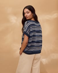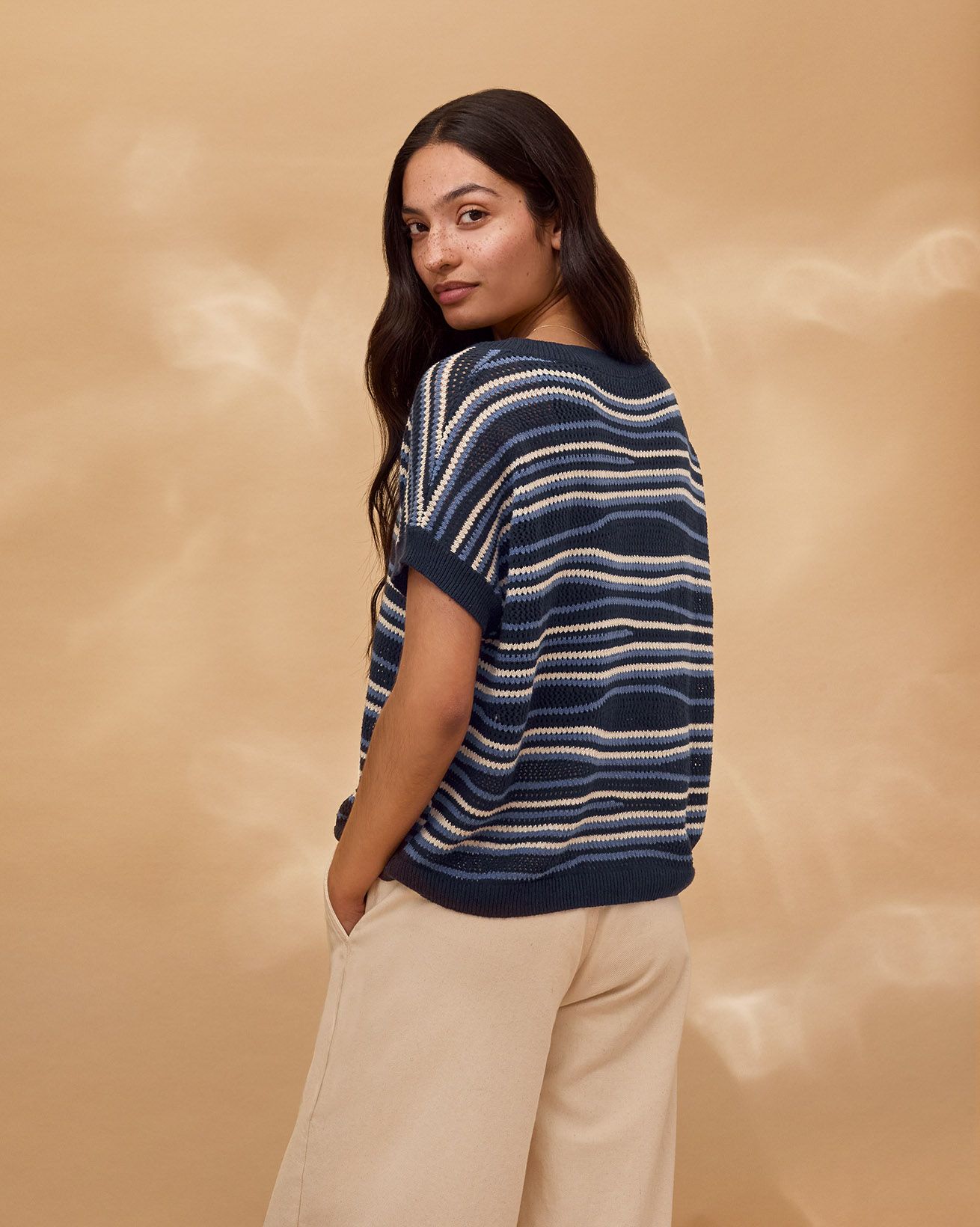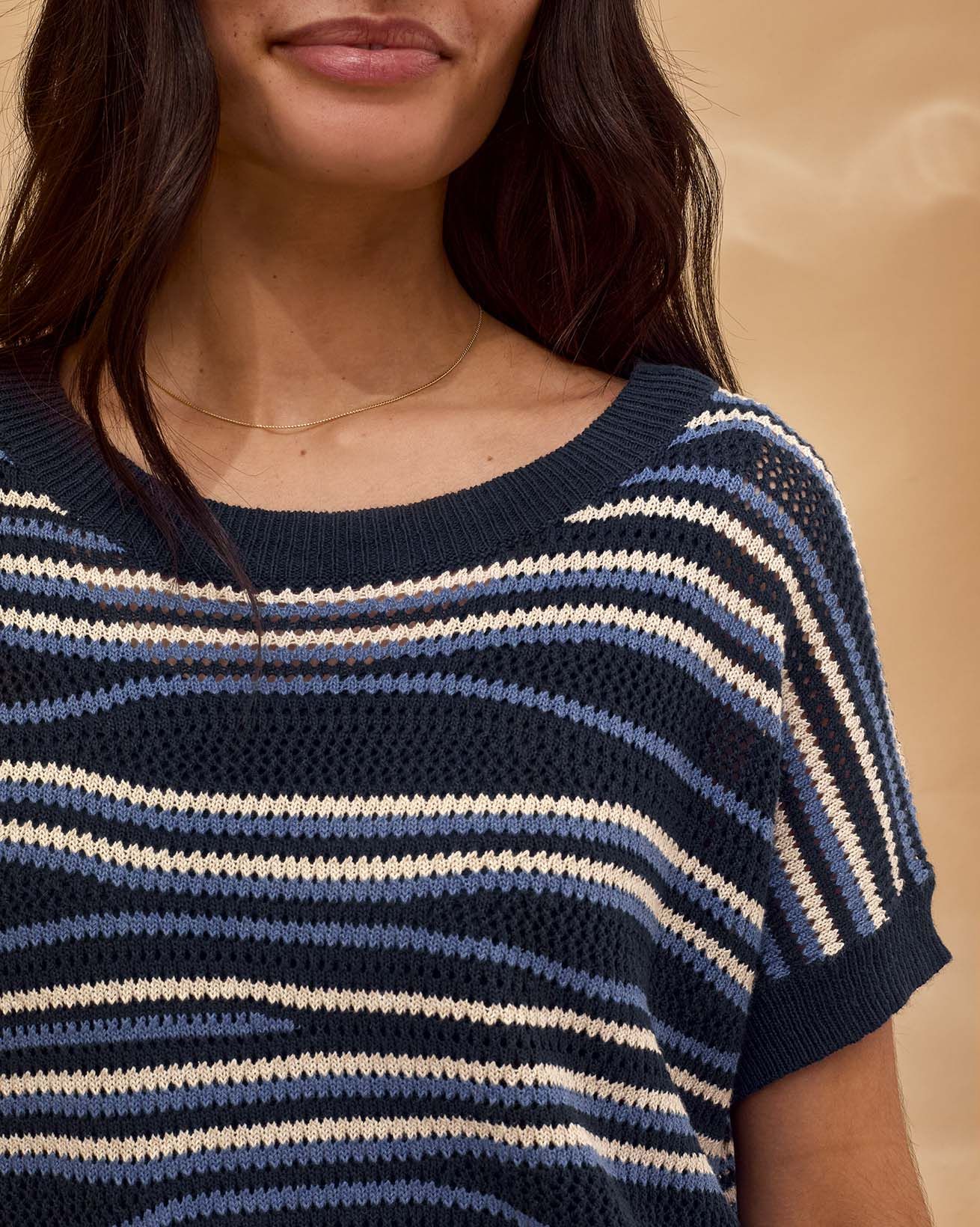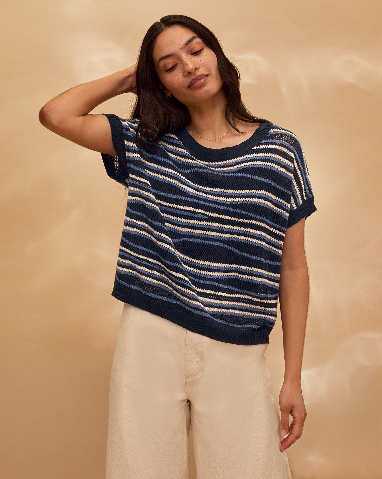 This boxy top features a round neckline and drop shoulder design, detailed with tonal stripes and an irregular pointelle stitch inspired by coastal landscapes. Finished with ribbed trims, it offers a refined yet relaxed silhouette that reflects natural textures and tones.