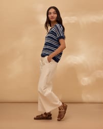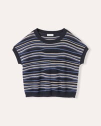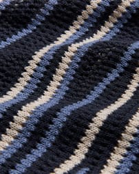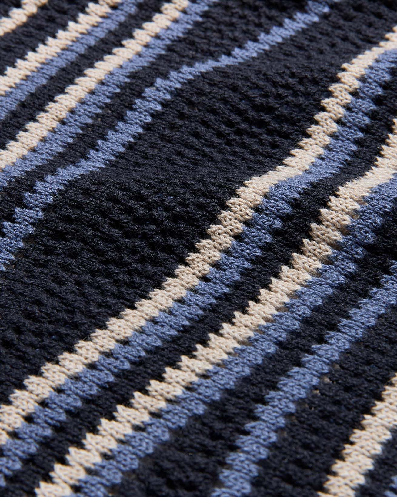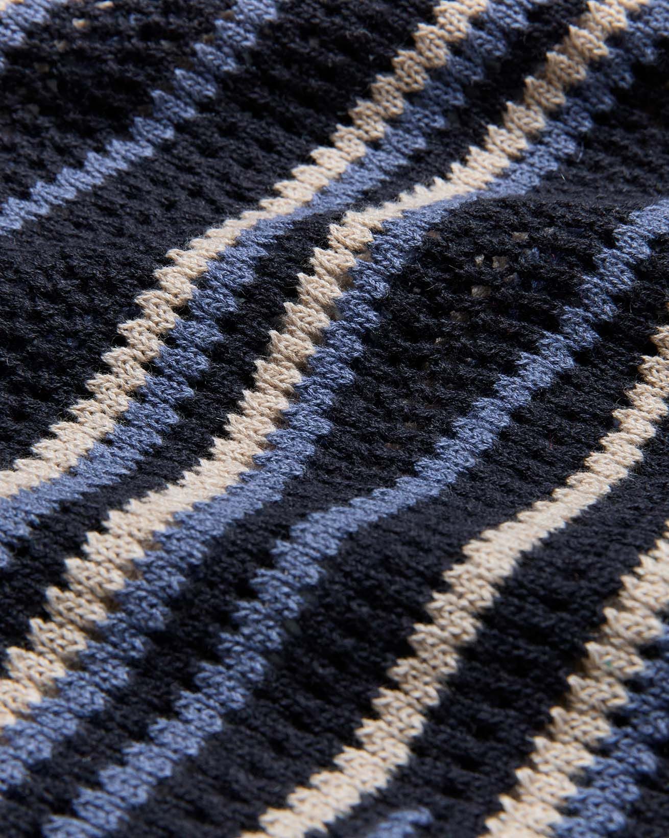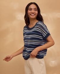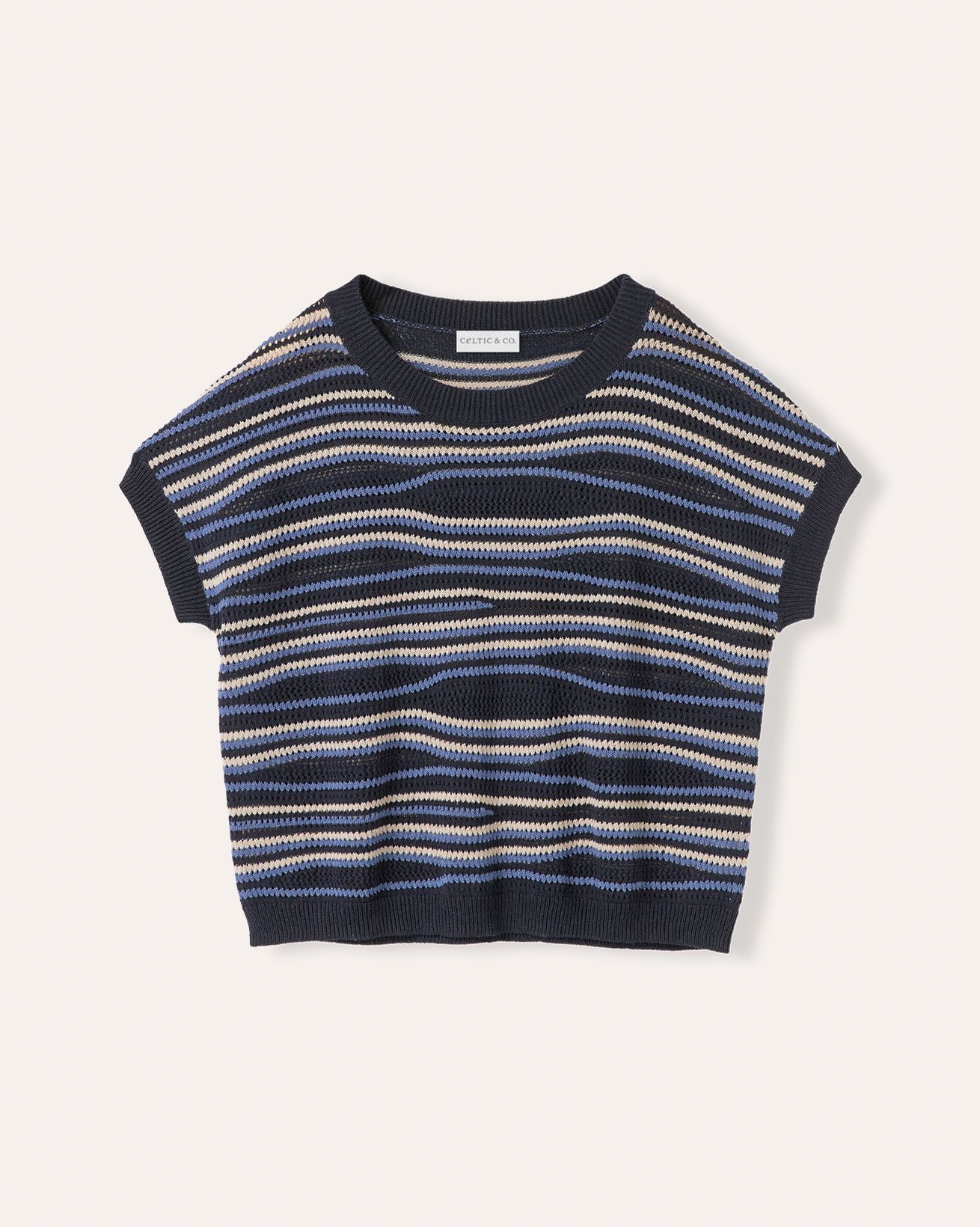 This boxy top features a round neckline and drop shoulder design, detailed with tonal stripes and an irregular pointelle stitch inspired by coastal landscapes. Finished with ribbed trims, it offers a refined yet relaxed silhouette that reflects natural textures and tones.