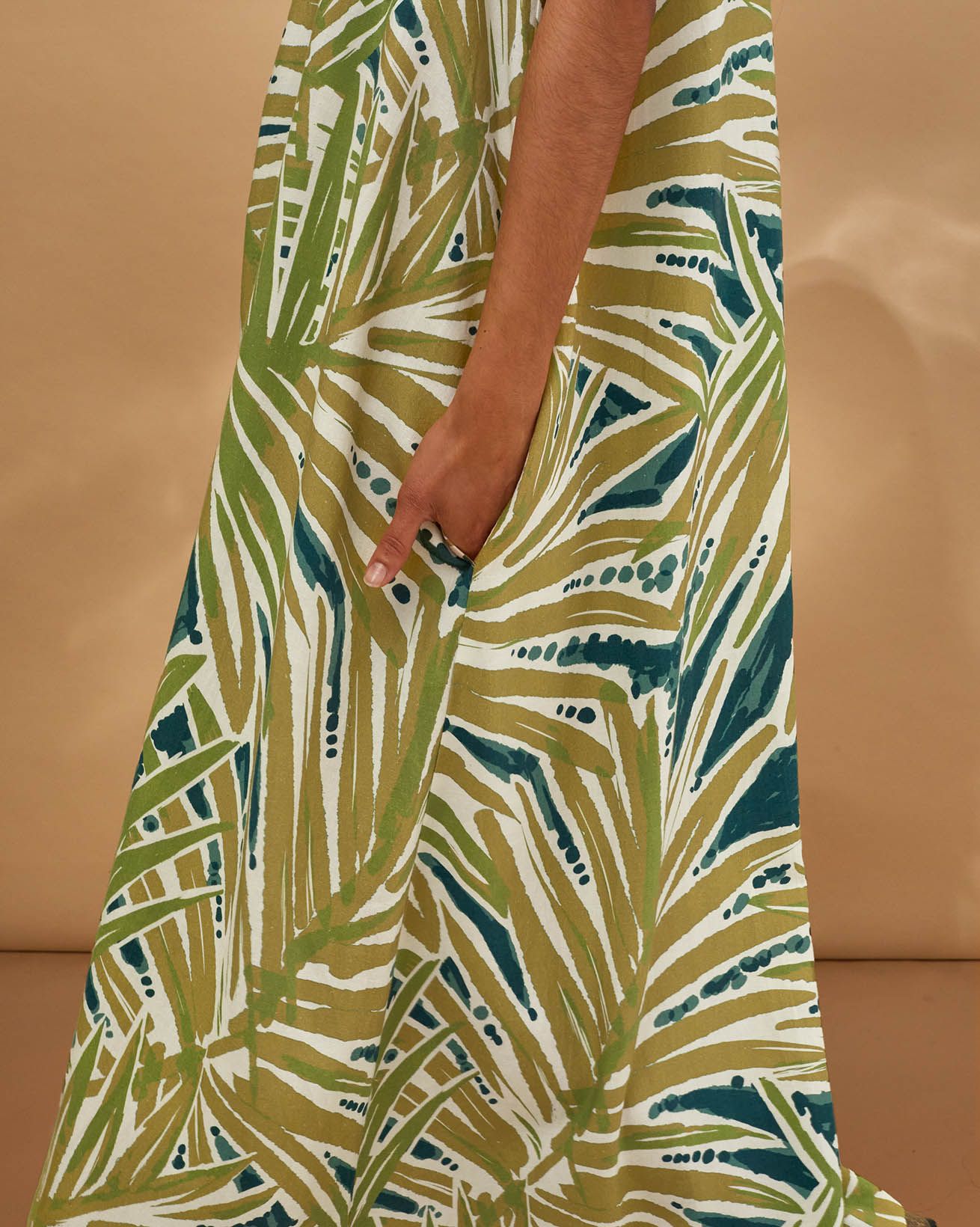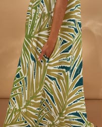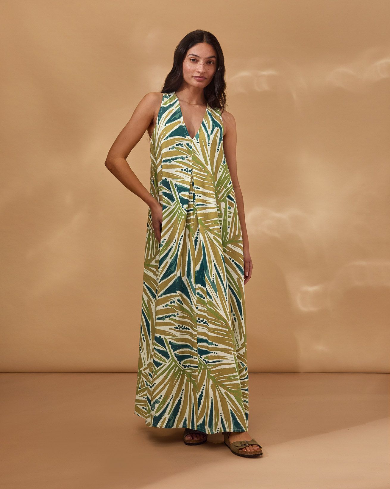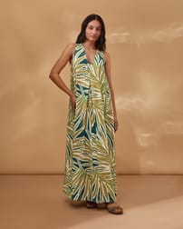 This sleeveless maxi dress features a relaxed, easy fit with a flattering V-neckline and a clean, fastening-free design. Crafted from fabric digitally printed to reduce water use and chemical waste, it offers a thoughtful choice for those seeking comfort and understated elegance in natural fibres. Simply pull over for effortless wear.