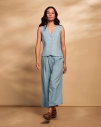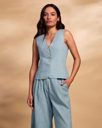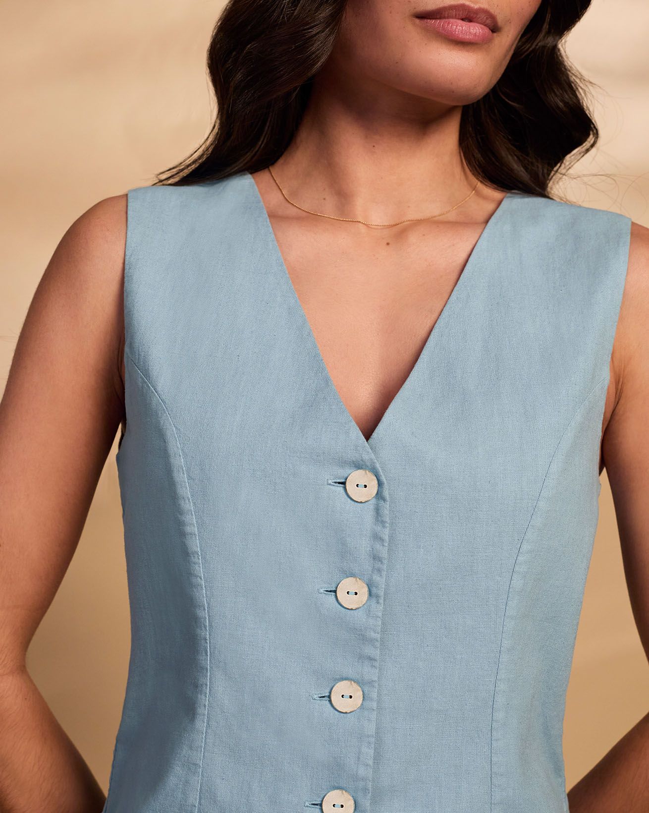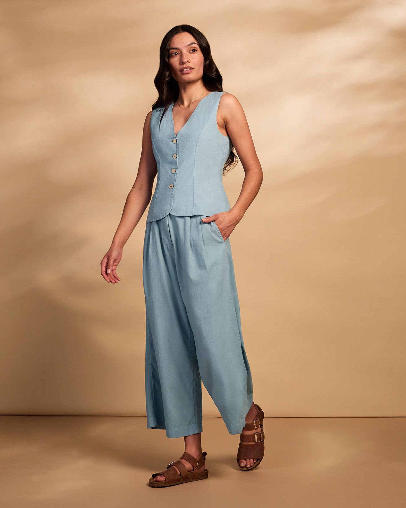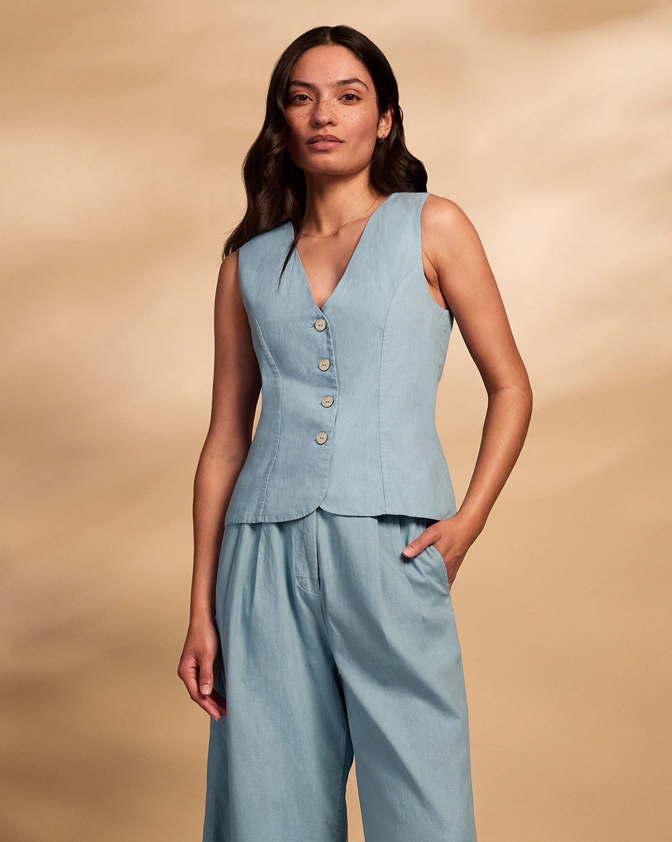 This tailored waistcoat features a sleek V-neckline and full button placket, crafted from a linen blend for a refined fit. Garment dyed in small batches, it minimises fabric waste by up to 15%, reflecting a thoughtful approach to production without compromising on quality or style.