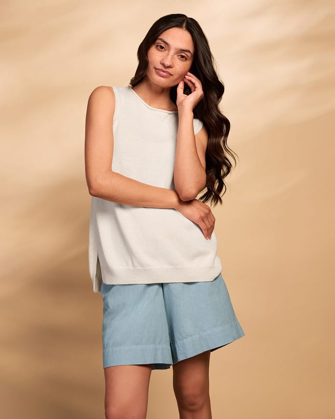 This tailored waistcoat features a sleek V-neckline and full button placket, crafted from a linen blend for a refined fit. Garment dyed in small batches, it minimises fabric waste by up to 15%, reflecting a thoughtful approach to production without compromising on quality or style.