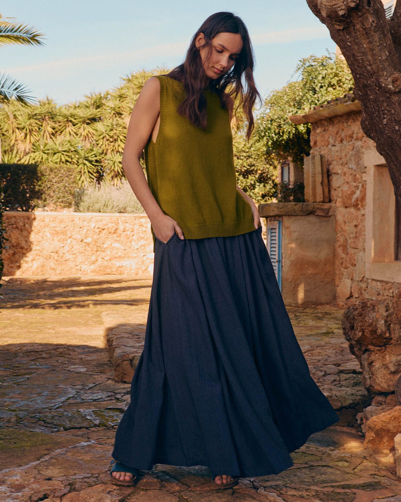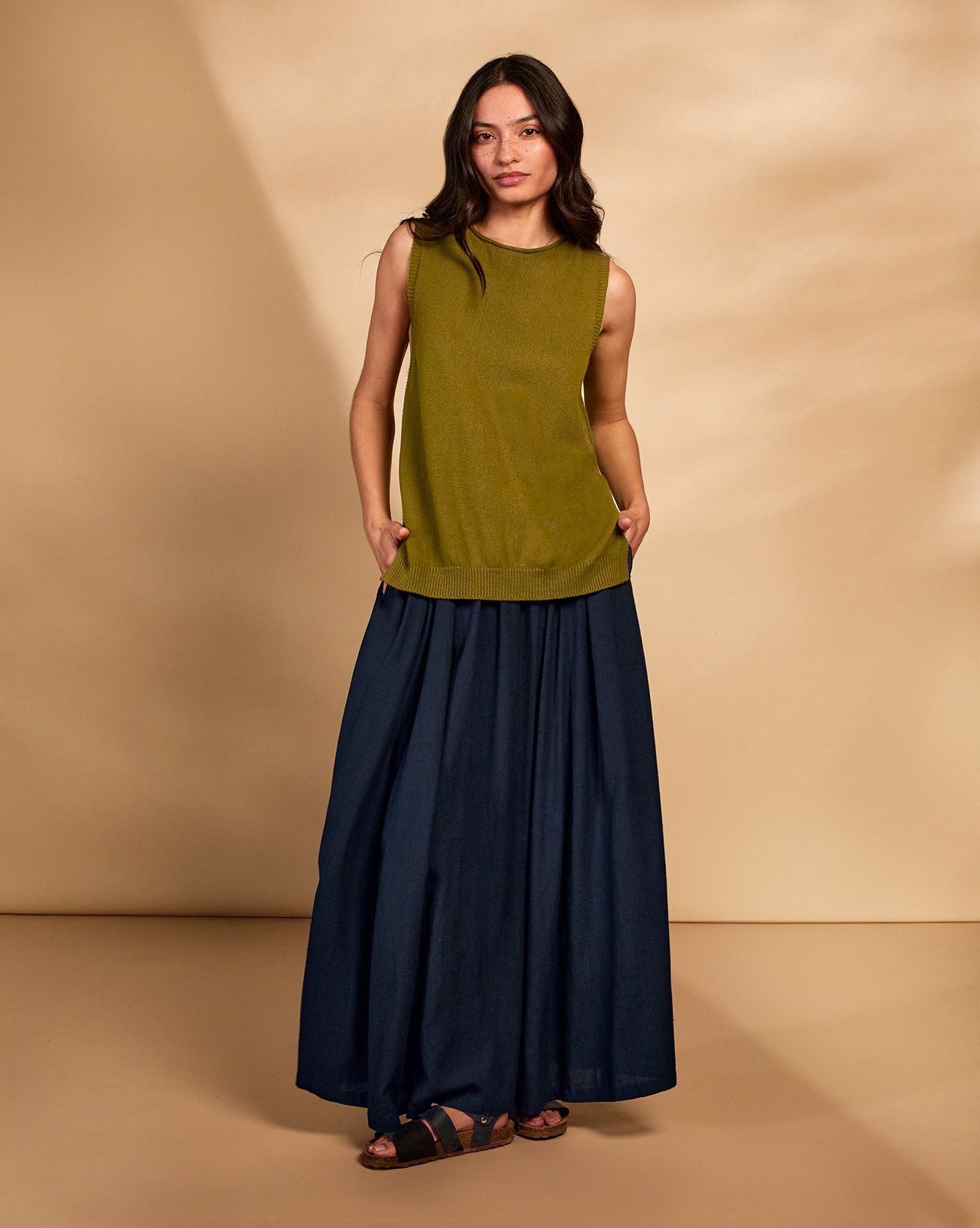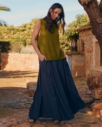 The woven maxi skirt features a soft drape fabric that moves gracefully with every step. Designed with a swing fit, they offer comfortable elegance for any occasion. The natural fibres provide a breathable, timeless addition to your collection, reflecting Celtic & Co.’s commitment to quality and thoughtful design.
