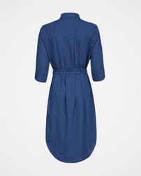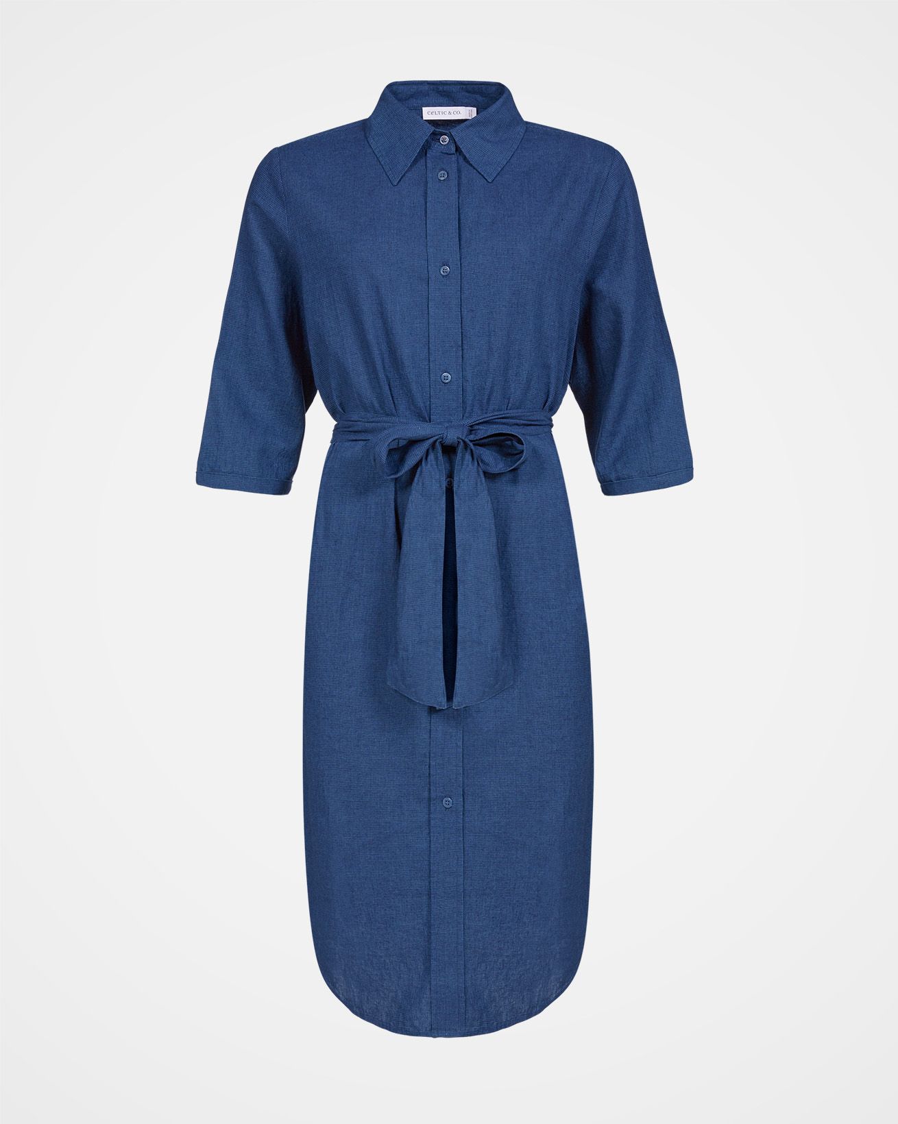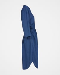 The perfect dress if you’re looking for light and breathable with a little more coverage. Washed to give it a beautiful, soft, tumbled look, this classic shirt dress is a flattering length. Featuring a curved hem, side pockets, half length, turn up cuff sleeves and collar detail. The fabric has a small check pattern throughout, creating texture. Use the self tie belt to style as you wish, either creating a fitted, cinched at the waist silhouette, or belt-less for a straight shirt dress style.