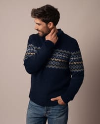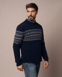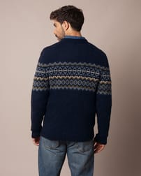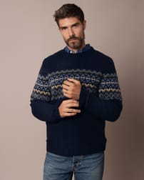 It's knitted in our classic Shetland-style yarn, which delivers a rustic handle and second-to-none warmth, and finished with ribbing at the collar, cuffs and hem. The oatmeal-fleck yarn is the perfect base for the coastal-inspired colour palette of the Fair Isle design.