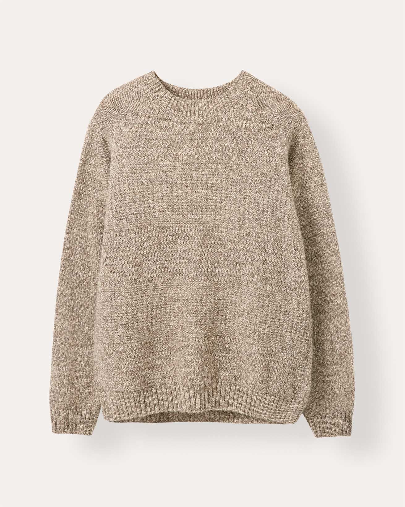 The Men's Saddle Shoulder Stitch Detail Jumper is made in Britain from British wool in an end-to-end process. It features a crew neck, saddle shoulder, and ribbed trims. The regular fit is enhanced by alternating stitch pattern stripes in subtly twisted tonal colours for added depth.