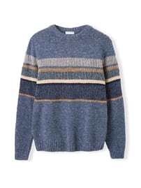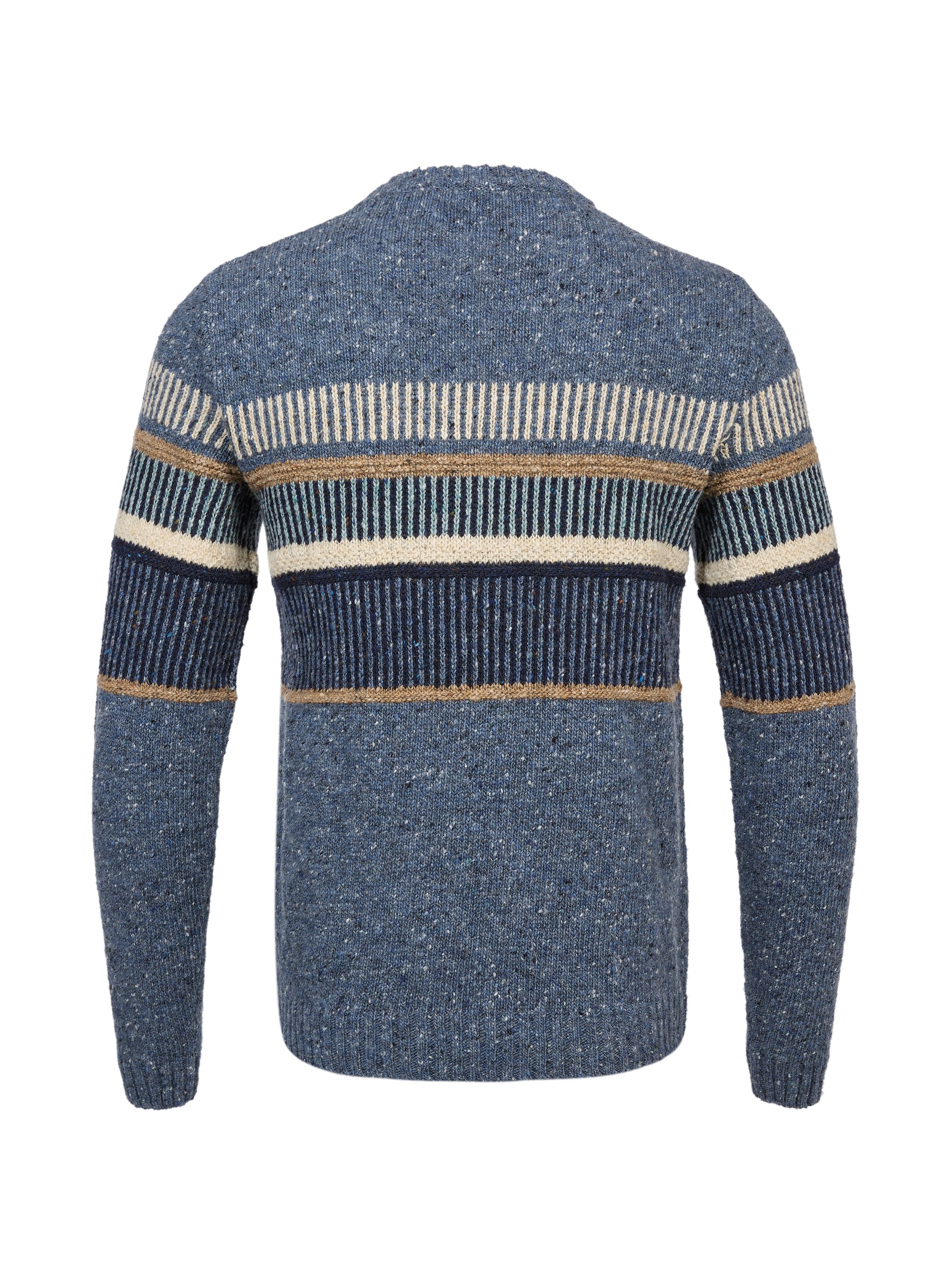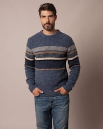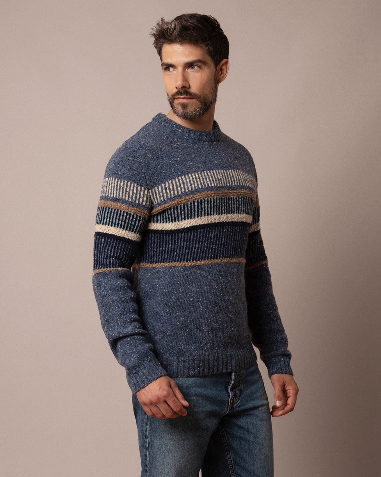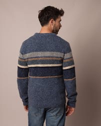 Made from real Donegal yarn, this wool jumper features a textured stitch pattern in contrasting colours running across the chest and sleeves. Created in a classic shape, we’ve opted for a crew neck plus a ribbed collar, cuffs and hem. It’s designed to be pulled on, worn with everything and well loved.
