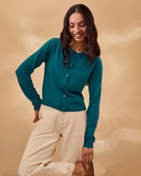 This fine knit merino crew neck cardigan features a slightly cropped silhouette with delicate lace hole detailing down the centre back. Part of our merino basics range, it combines natural warmth and softness with subtle details, offering a refined, classic style that honours timeless quality and thoughtful design.