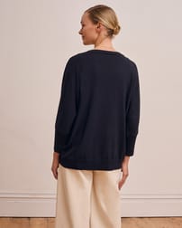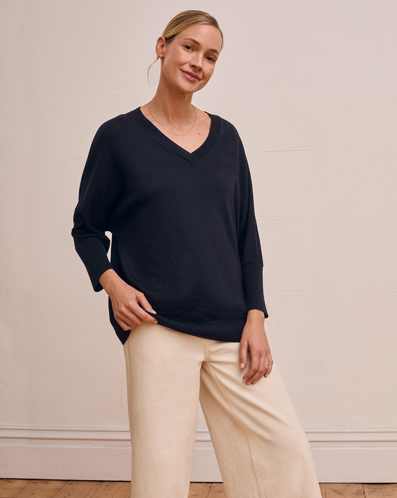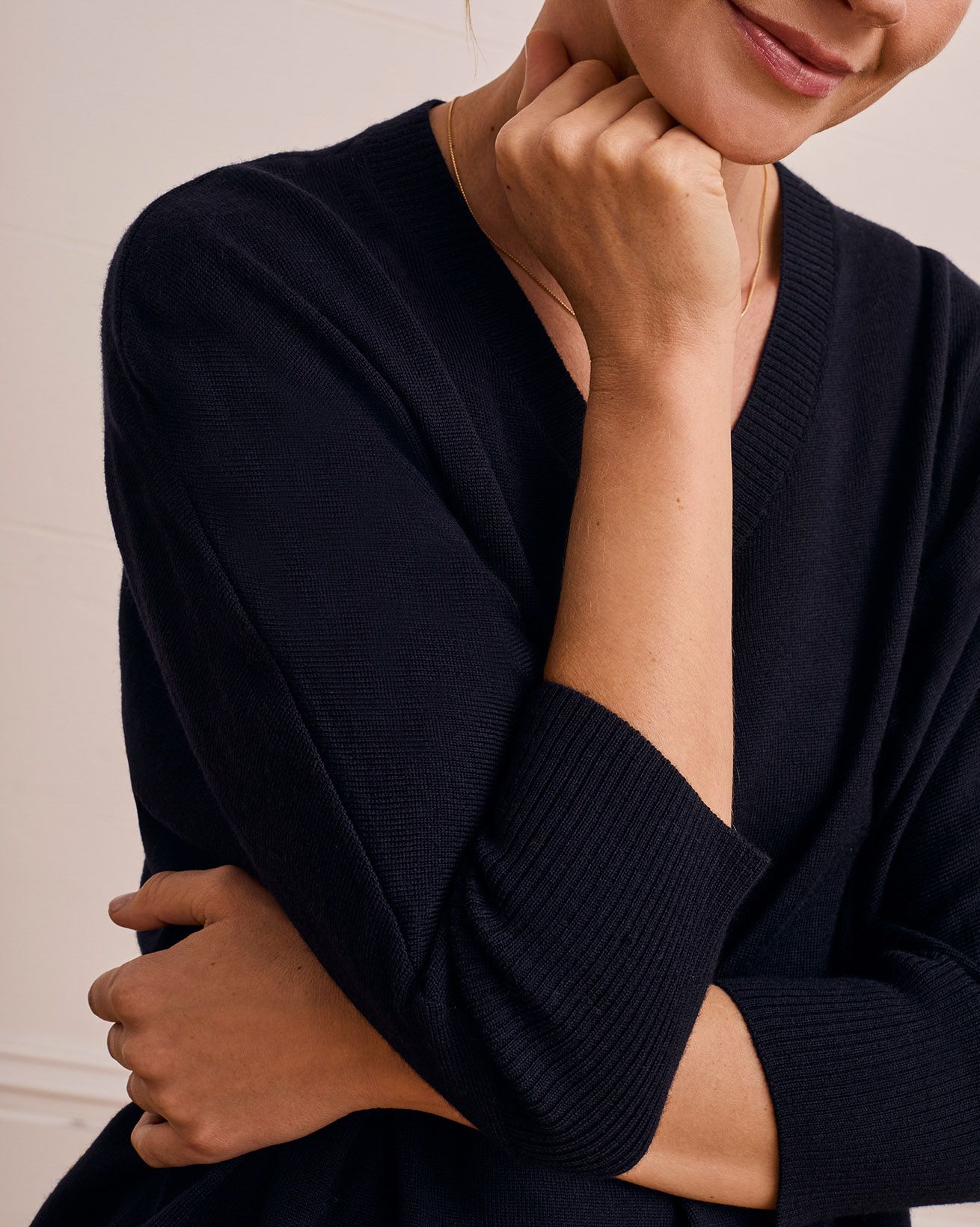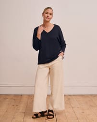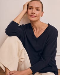 Part of our Merino basics range, this relaxed-fit jumper features a crossover V-neck and cropped sleeves with deep ribbed cuffs. Crafted from soft Merino wool, it offers natural warmth and comfort, as a timeless addition to your wardrobe. The slouchy silhouette ensures effortless wear throughout the seasons.