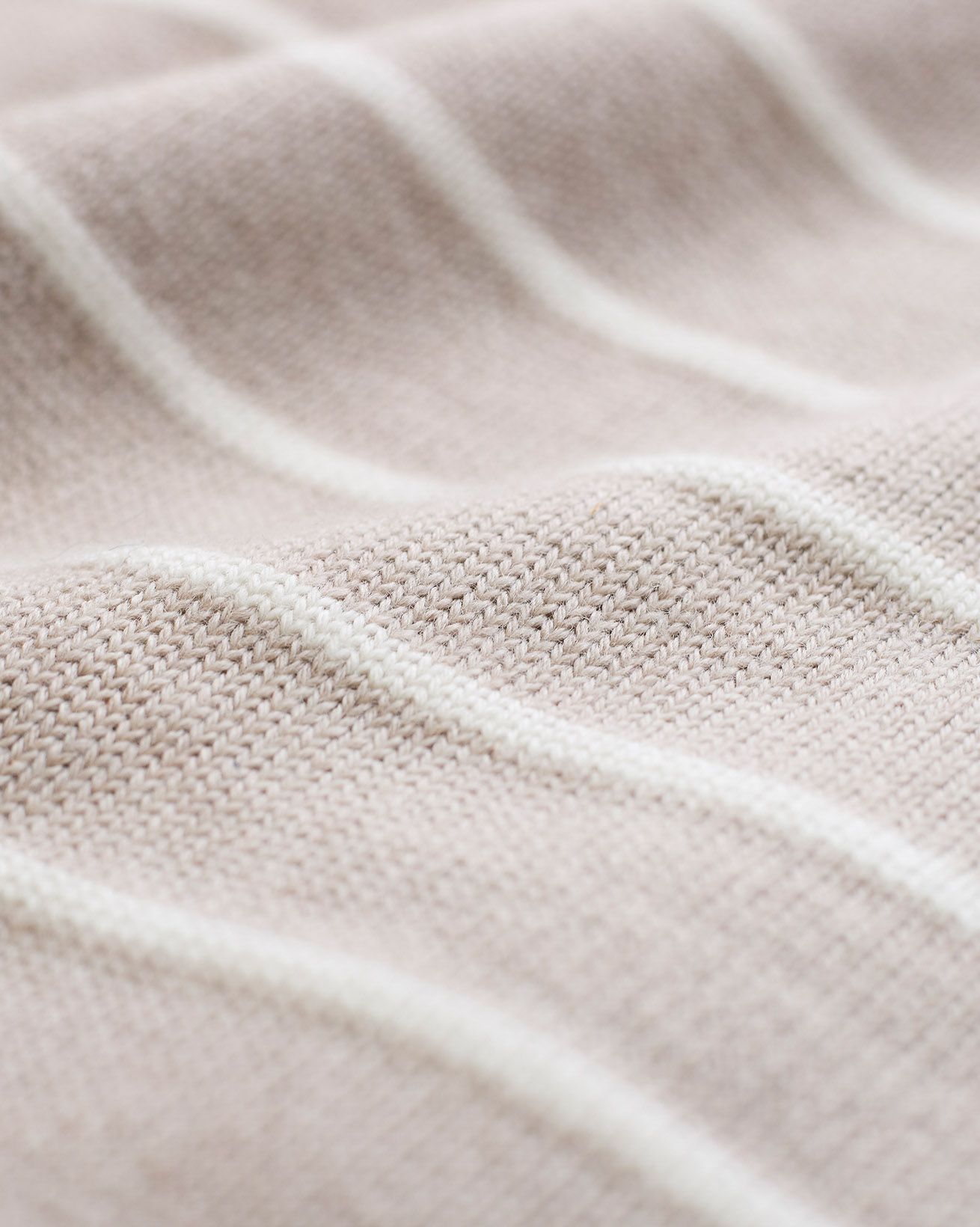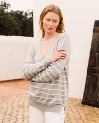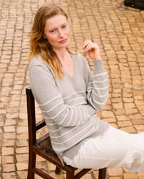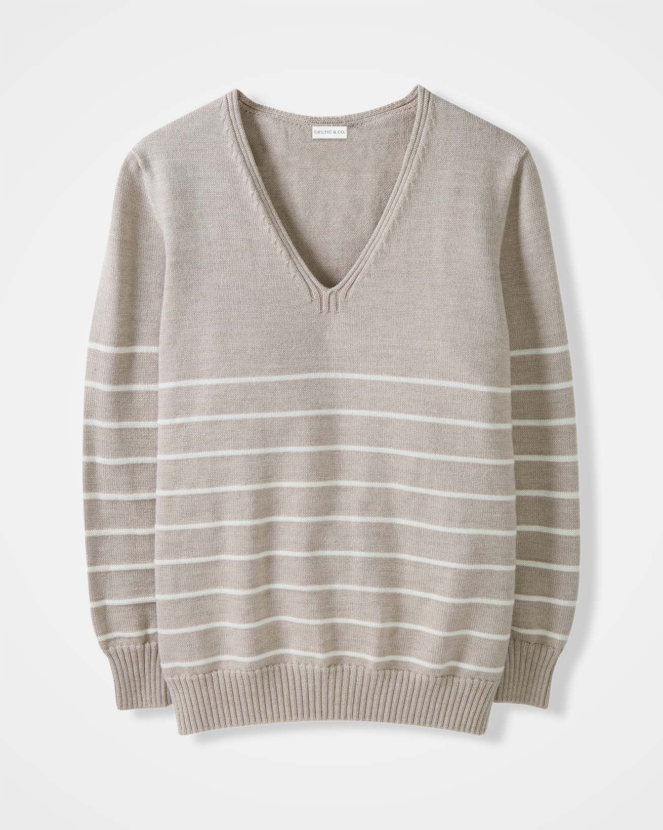 Our Merino V Neck Jumper has been seamlessly knitted in Britain with full-length sleeves and a ribbed hem and cuffs. The clean, luxury handle of the merino wool offers warmth to a traditional v-neck style in a contemporary breton stripe design. Whether you're layering up for the evening or keeping it casual, this jumper is a versatile choice for any occasion.