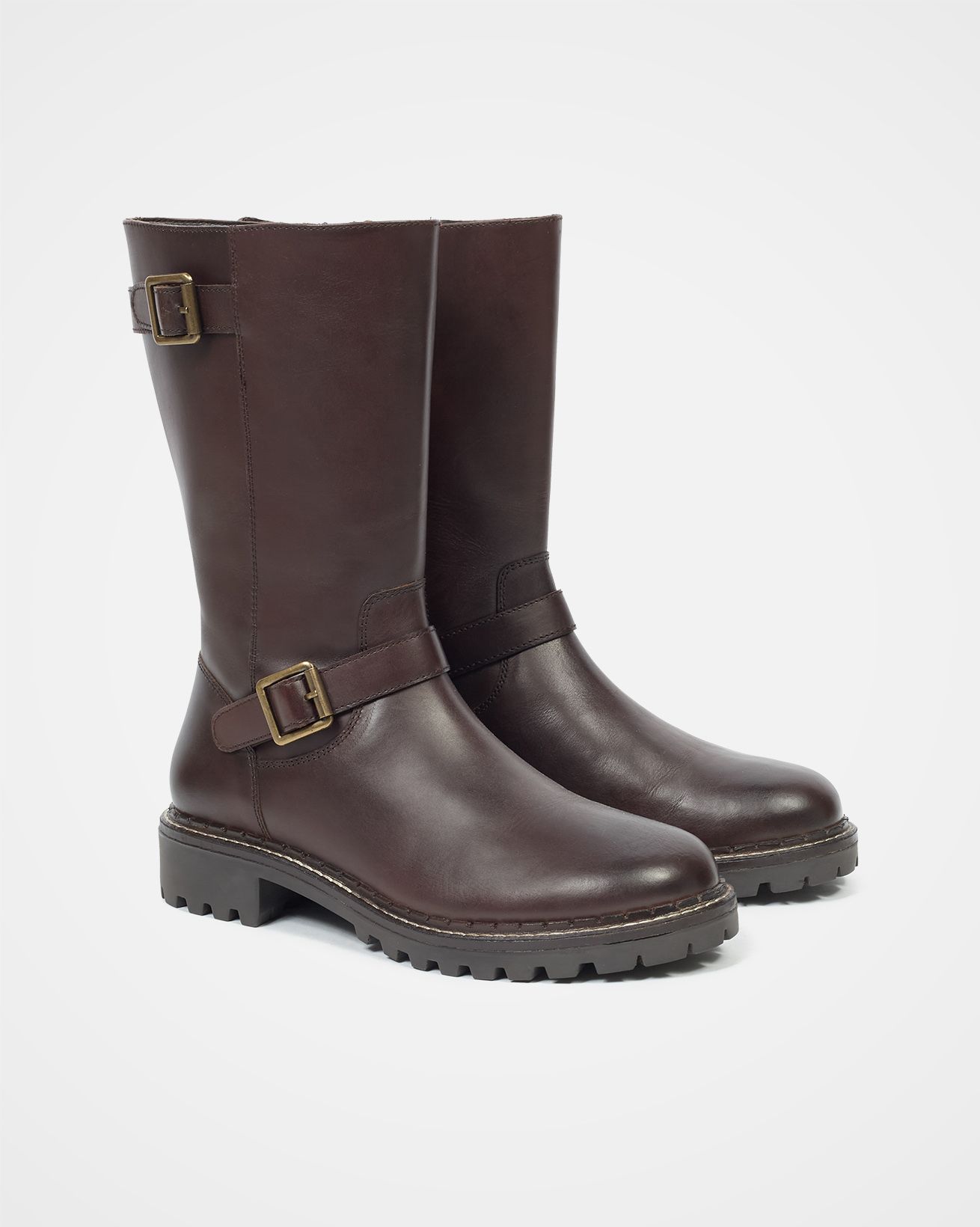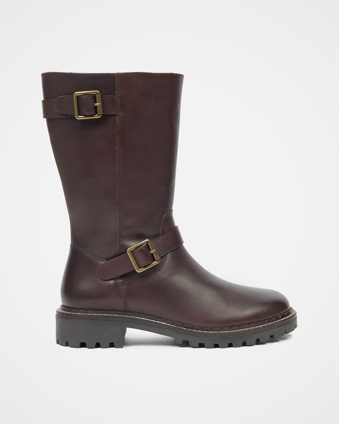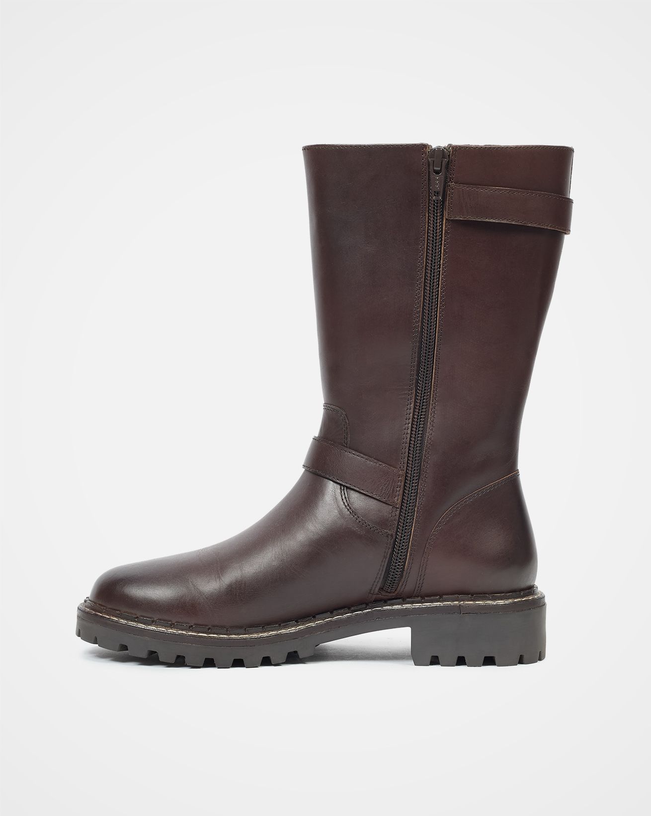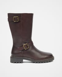 Featuring a leather upper, these Mid-Calf Biker Boots come with buckle and strap detailing. The leather lining and zip opening ensure easy dressing and comfort.
