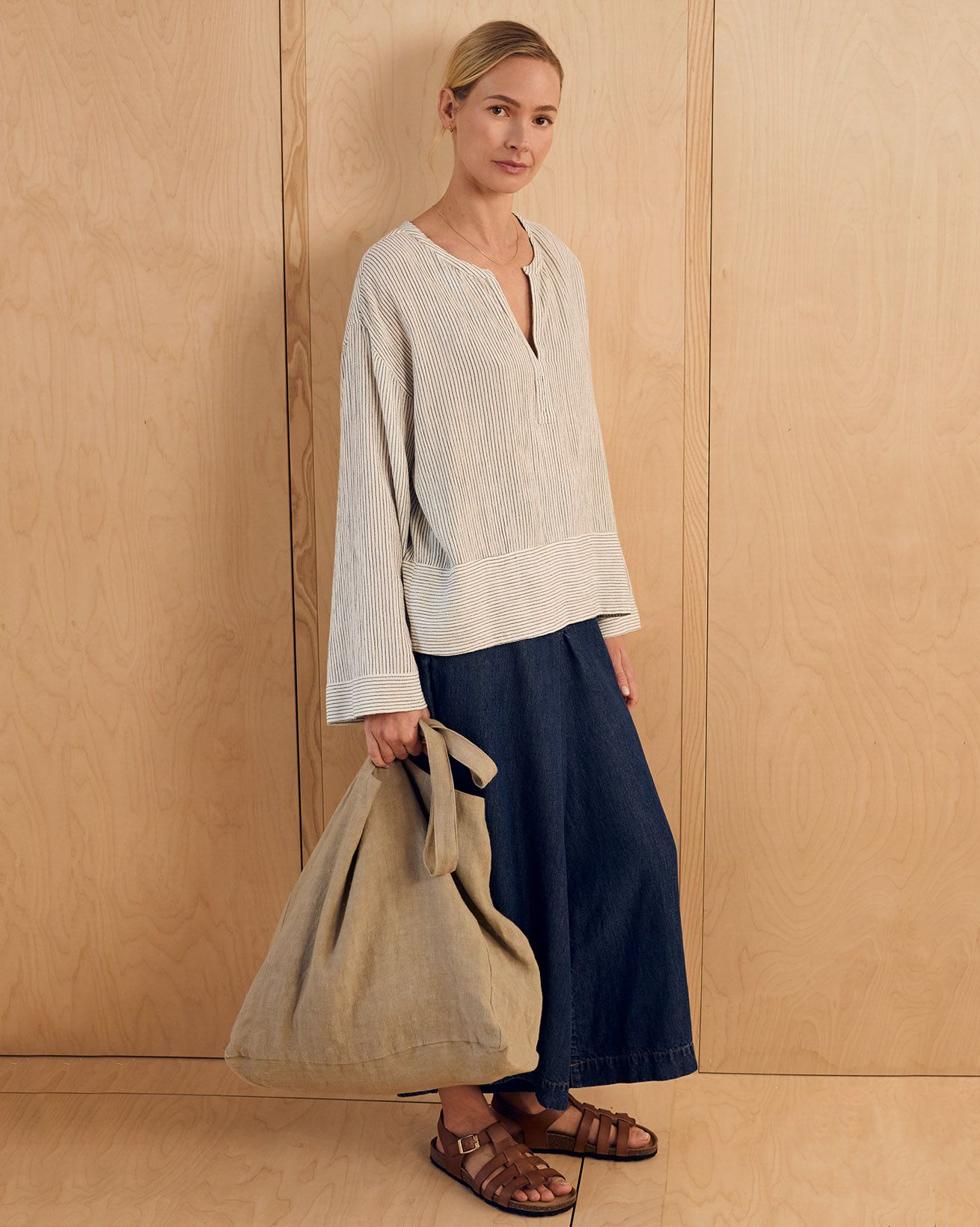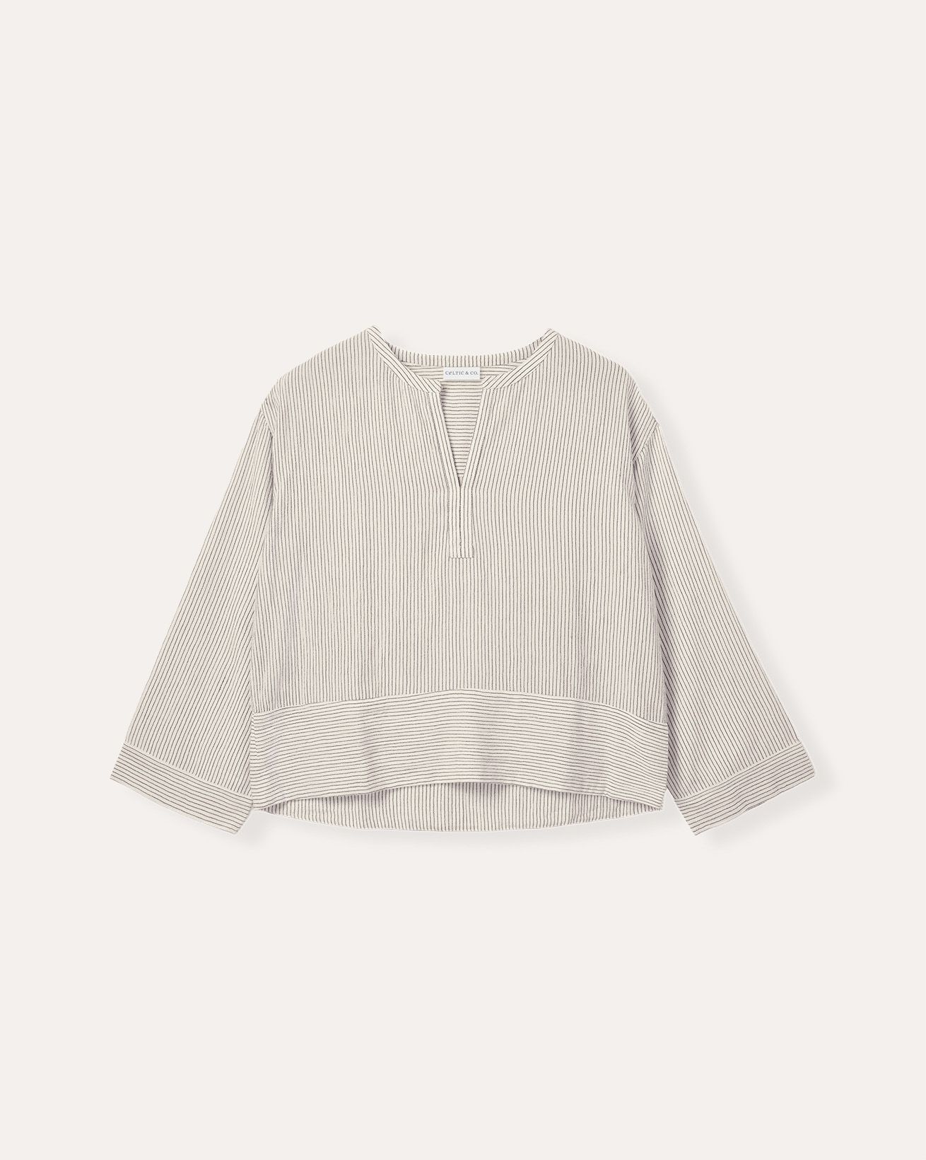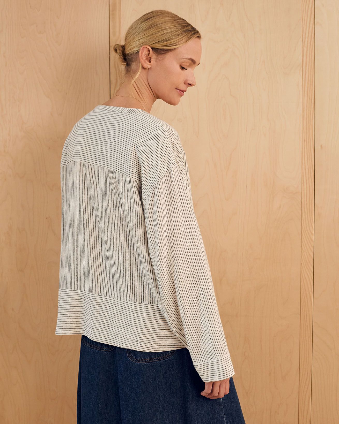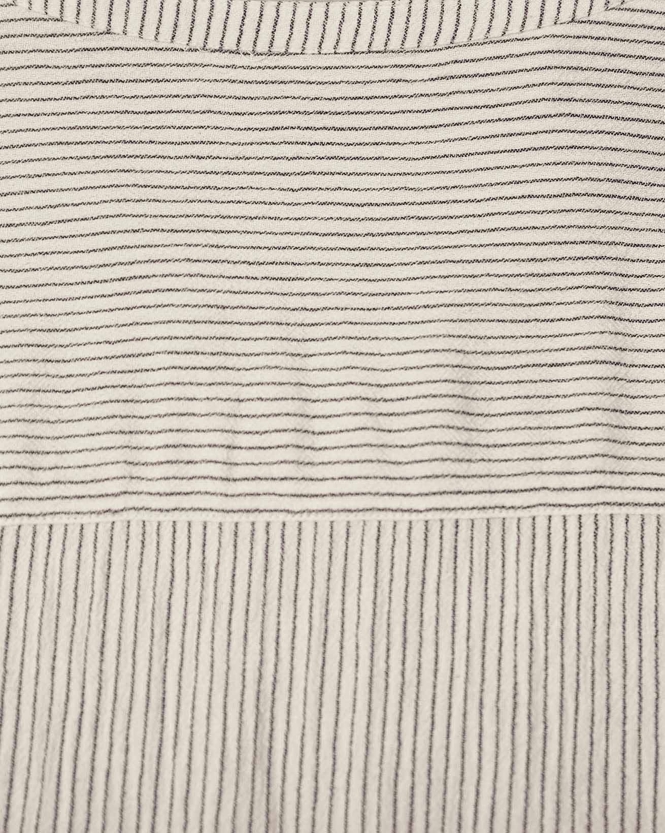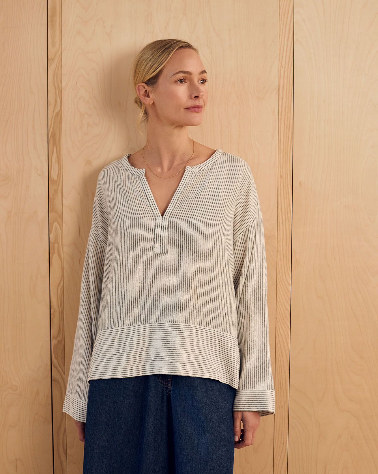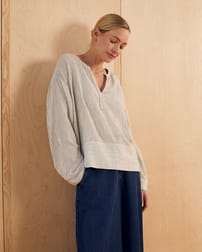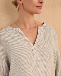 This relaxed-fit swing top features a yarn-dyed stripe fabric that brings subtle texture and depth. Designed with a V-neckline and long sleeves, it offers a timeless silhouette with a full button placket for a refined finish. Crafted to provide comfort and enduring style, it is a versatile addition to any wardrobe.