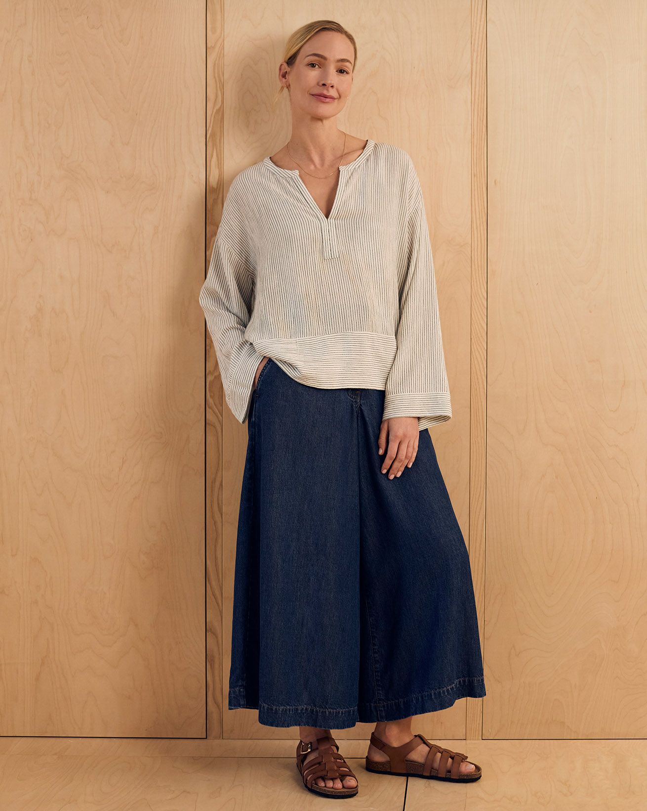 This relaxed-fit swing top features a yarn-dyed stripe fabric that brings subtle texture and depth. Designed with a V-neckline and long sleeves, it offers a timeless silhouette with a full button placket for a refined finish. Crafted to provide comfort and enduring style, it is a versatile addition to any wardrobe.