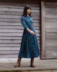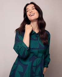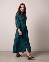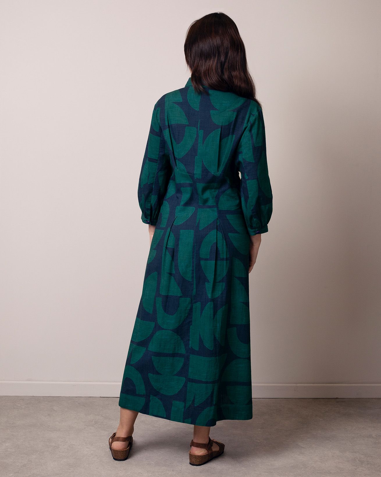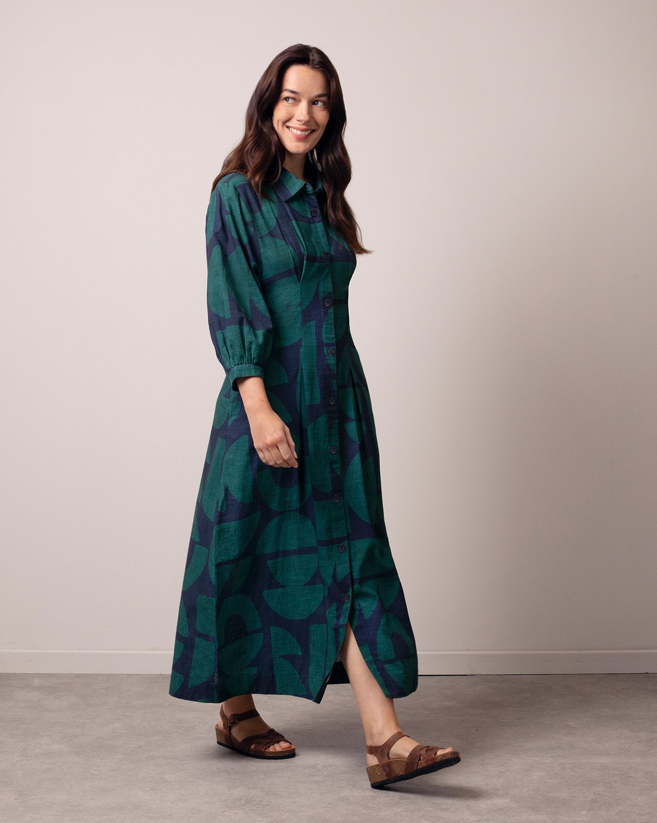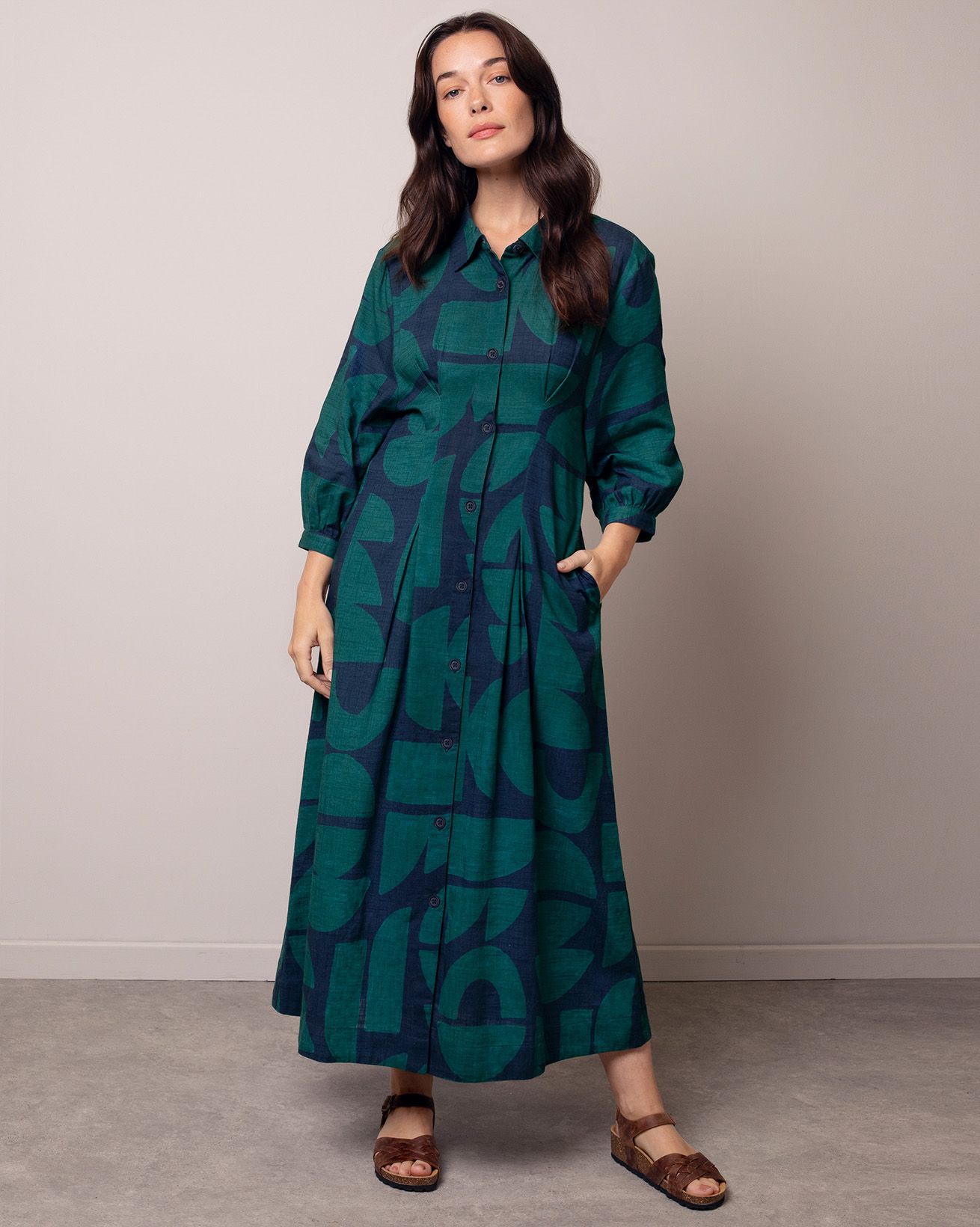 Our fitted shirt dress features a collared neckline and three-quarter sleeves, finished with a full button placket and delicate pleat detail. Made from organic cotton slub fabric that has been digitally printed to reduce water use and chemical waste, it offers a thoughtful blend of comfort and mindful design for everyday wear.