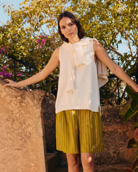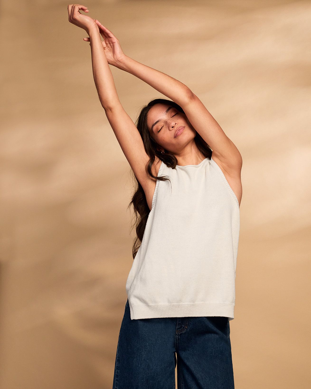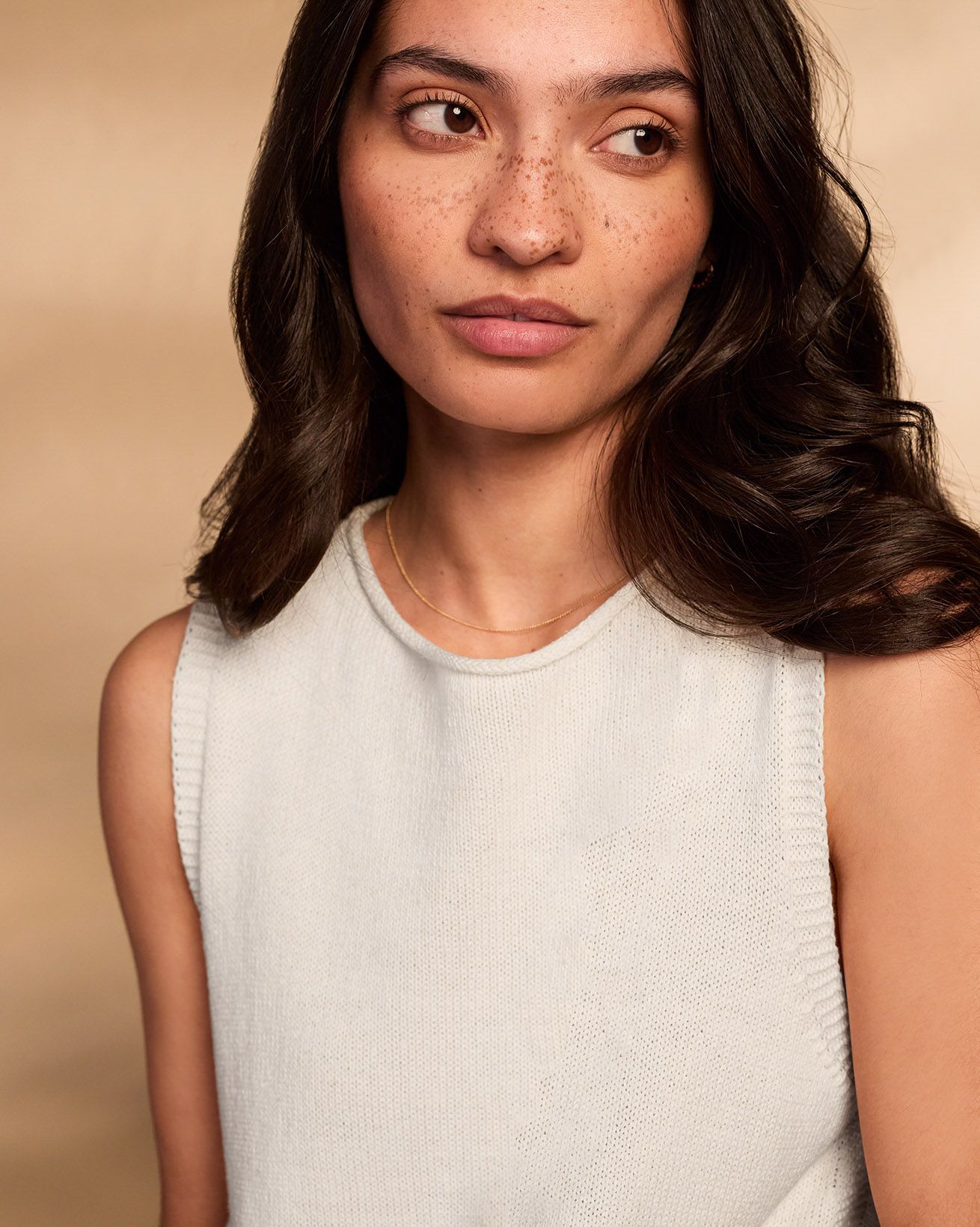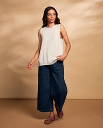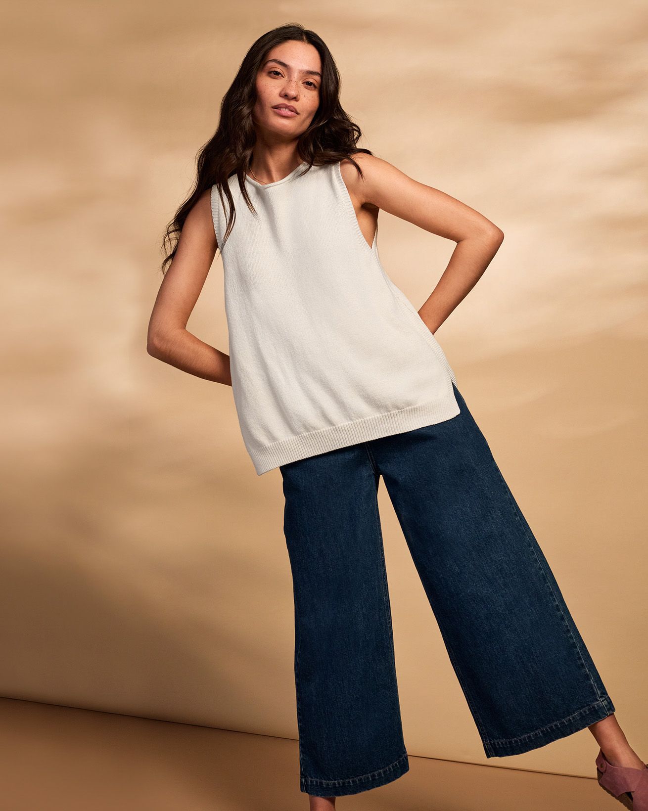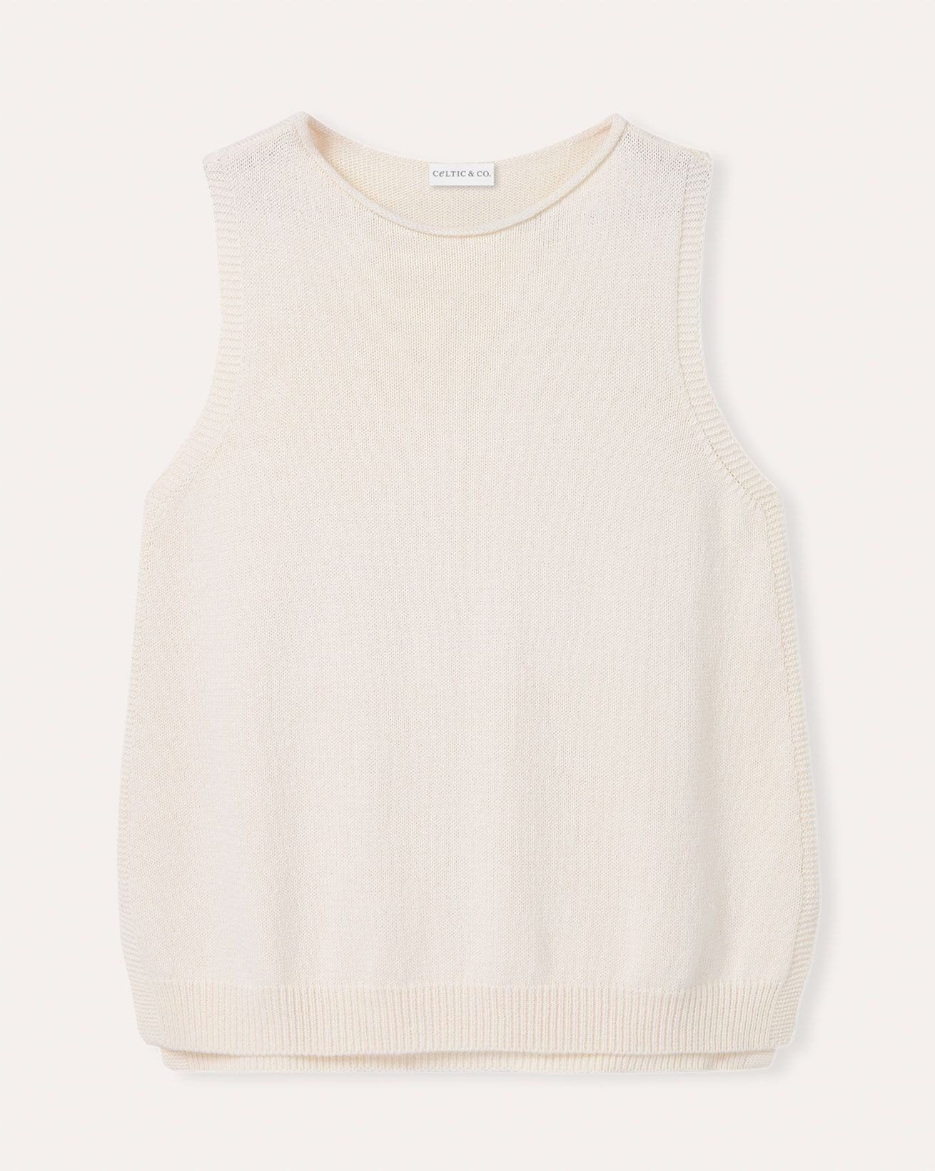 This sleeveless vest top features a slash neckline with roll edge trim and subtle garter stitch detailing around the armholes and side seams. Made from a soft blend of Supima cotton and organic hemp, it offers a smooth finish with a gentle drape, perfect for summer wear. Side splits and a ribbed hem complete its refined, natural appeal.