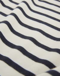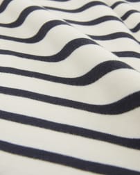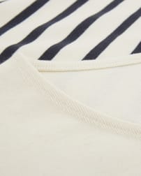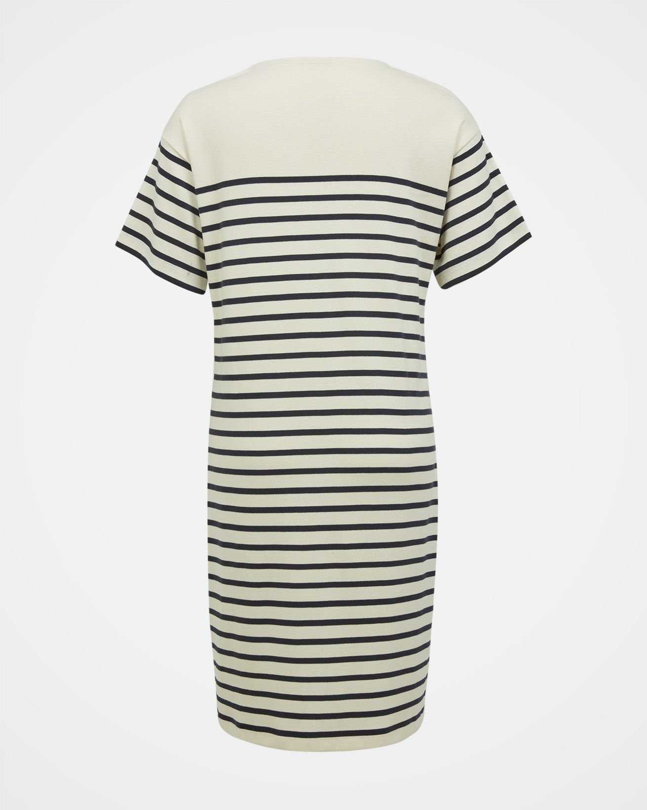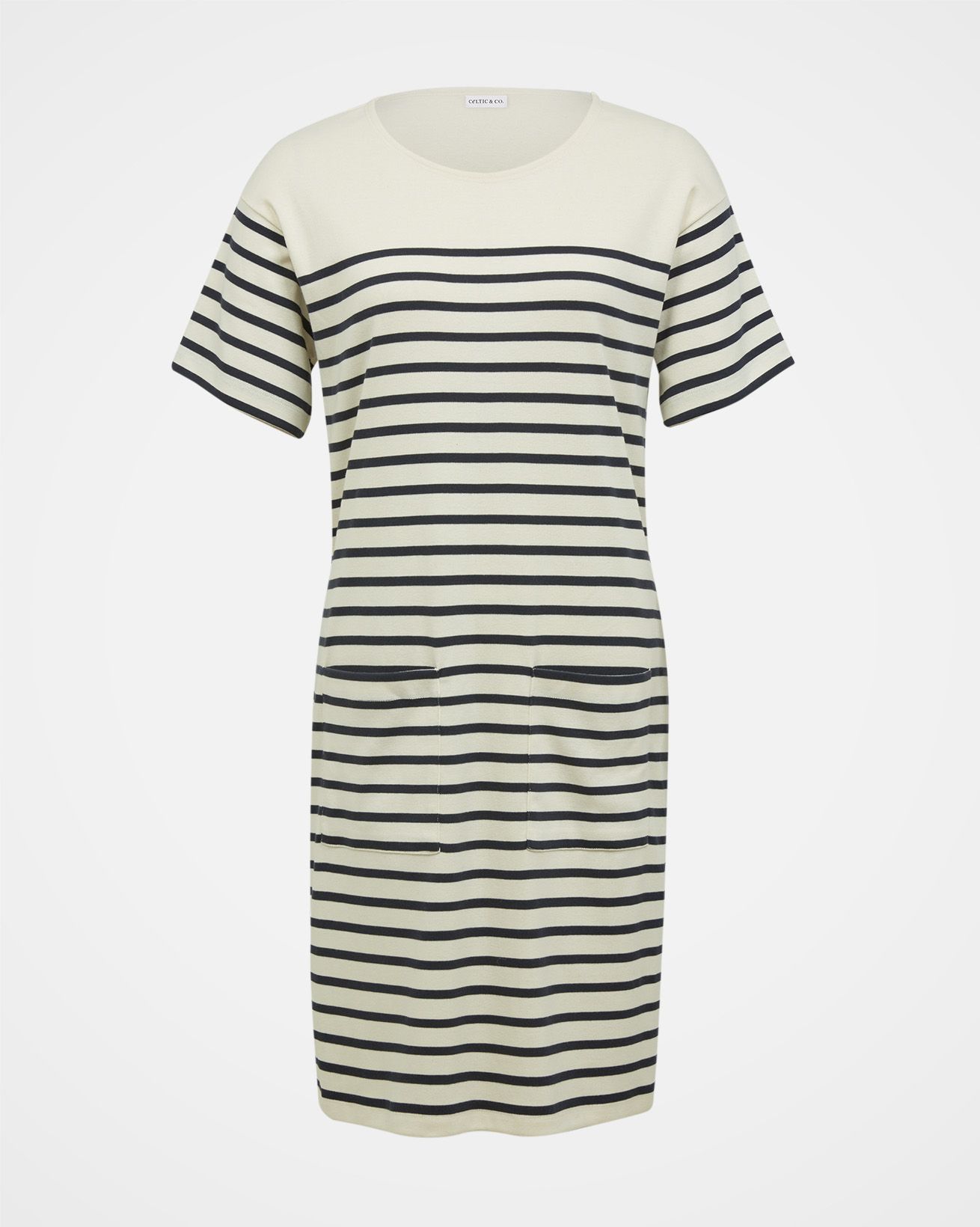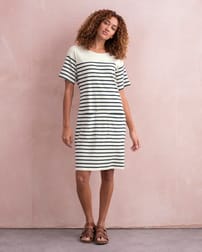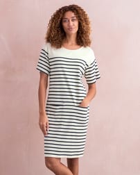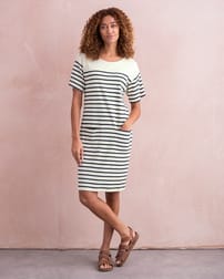 Step into timeless style with our Organic Cotton Jersey Knee Length Dress. This classic T-shirt dress shape features a slight drop shoulder and relaxed body fit with contemporary wide short sleeves. The placement engineered stripe adds a classic breton look, with two patch pockets on the front of the dress for practical, easy wear. Crafted from mid-weight crepe handle fabric, the material offers a flattering drape and a comfortable feel.