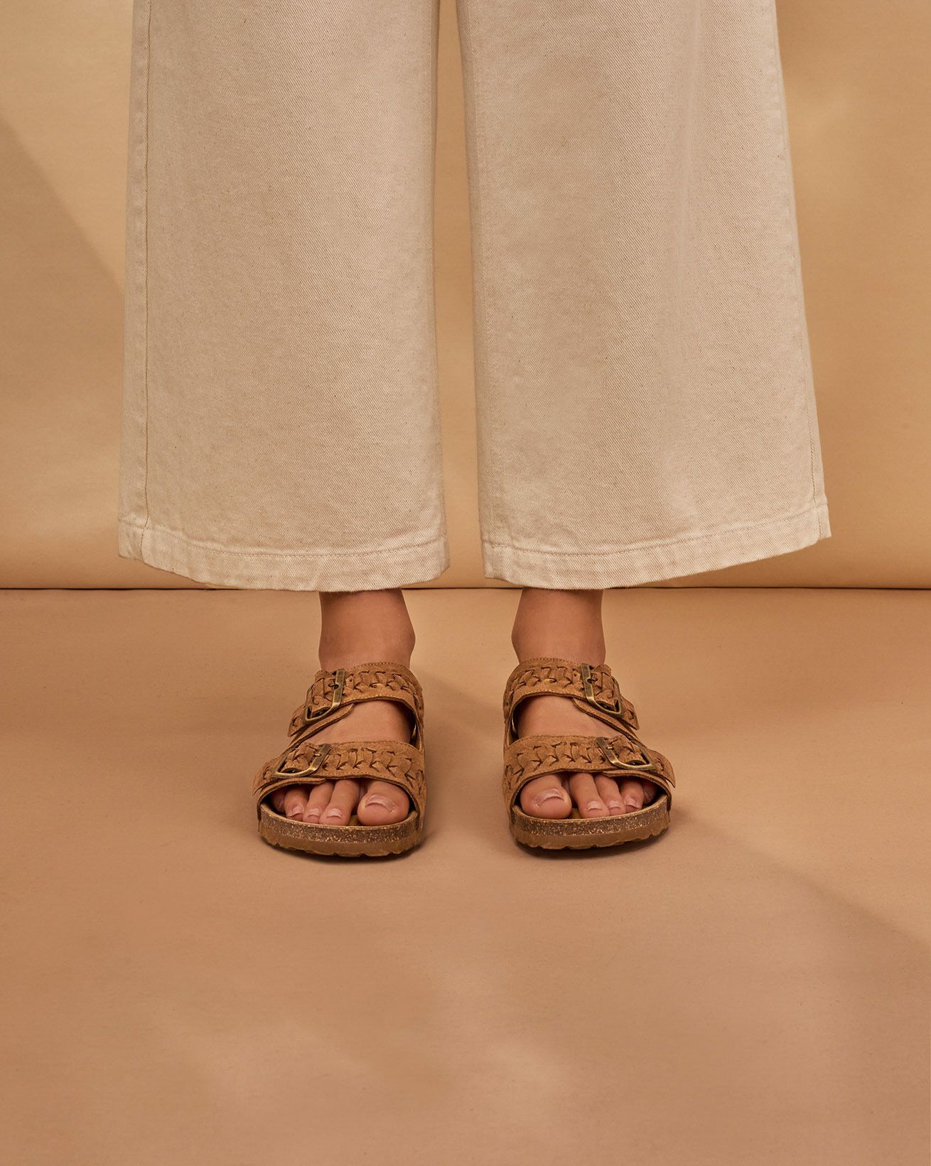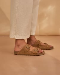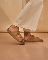 Elevate easy summer dressing with these slip-on slides, crafted with a soft cow suede upper featuring intricate plait detailing and metal buckle accents. A smooth suede insole provides cushioned comfort, while the cork and rubber outsole offers lightweight flexibility and natural grip—perfect for effortless, everyday wear.