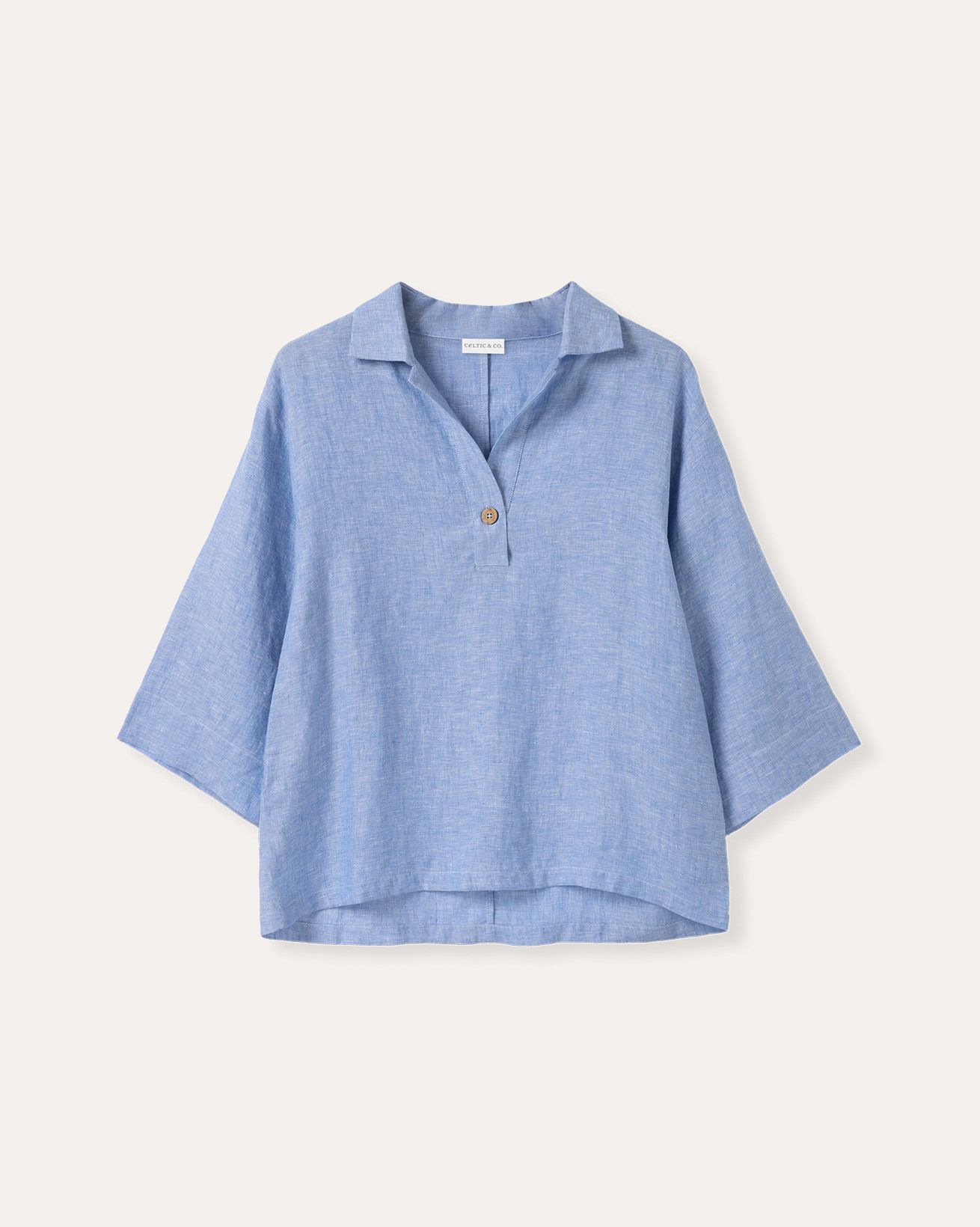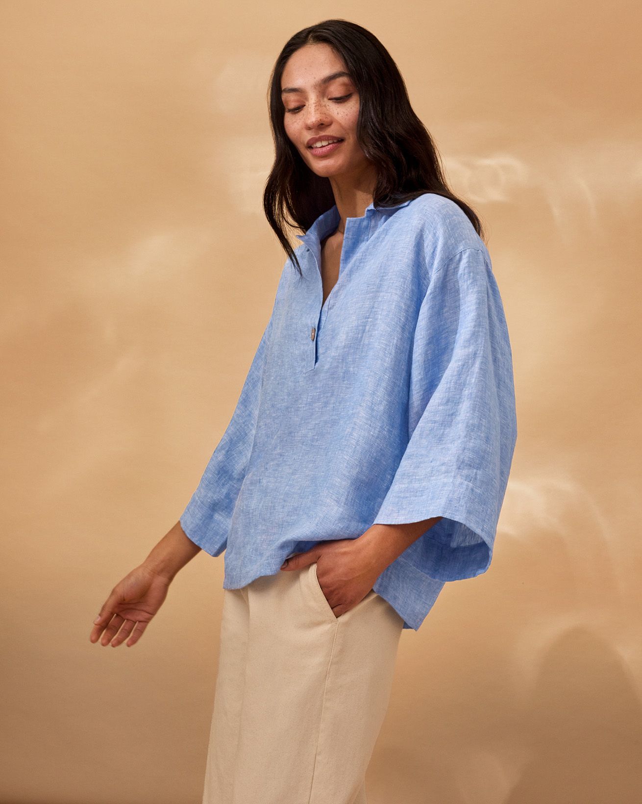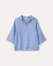 Our relaxed-fit popover top features a classic collared neckline and long sleeves for timeless appeal. Finished with natural coconut buttons, it reflects a thoughtful approach to materials, blending comfort with subtle sustainable details for a garment that feels as good as it looks.