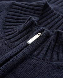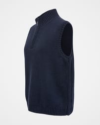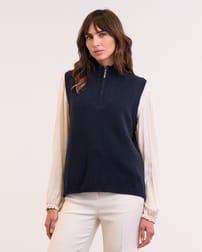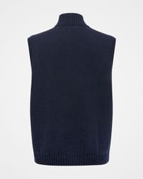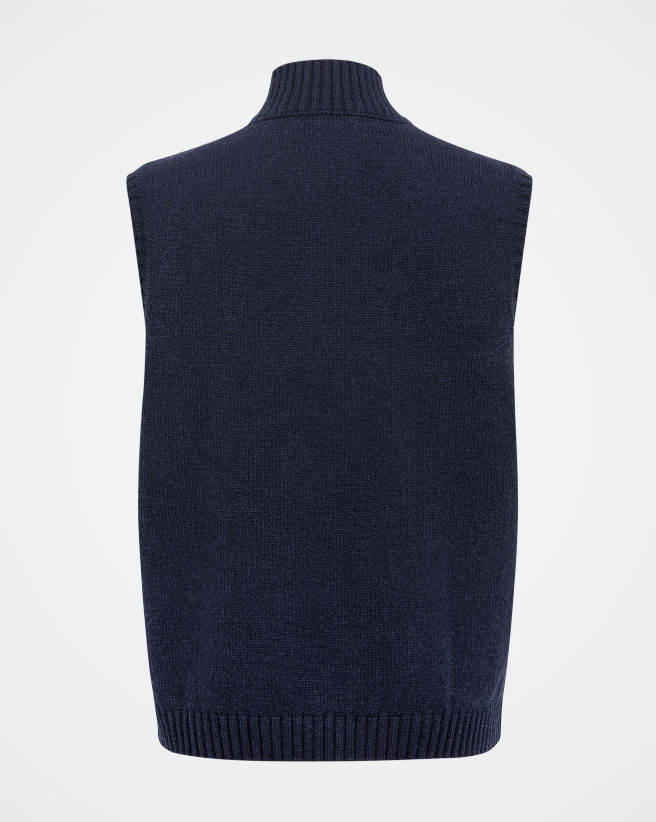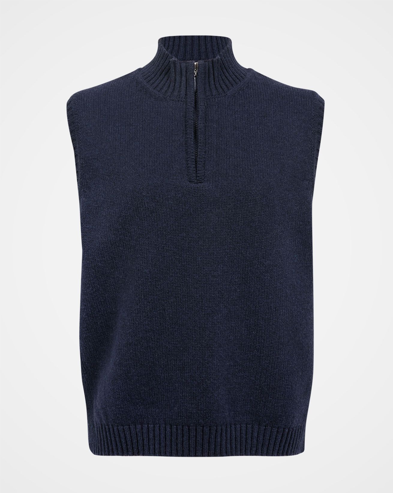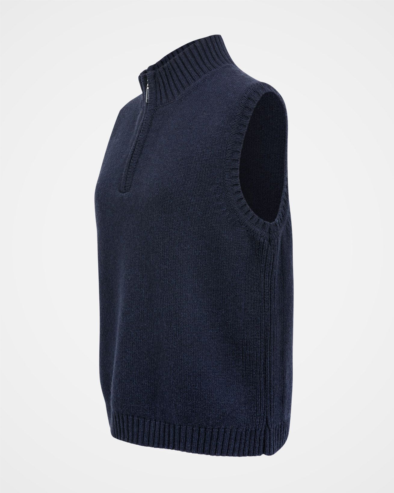 Featuring a funnel neckline with a quarter-length metal zip, this sleeveless top is perfect for layering. Made from soft Merino lambswool, it combines comfort and functionality for versatile wear.