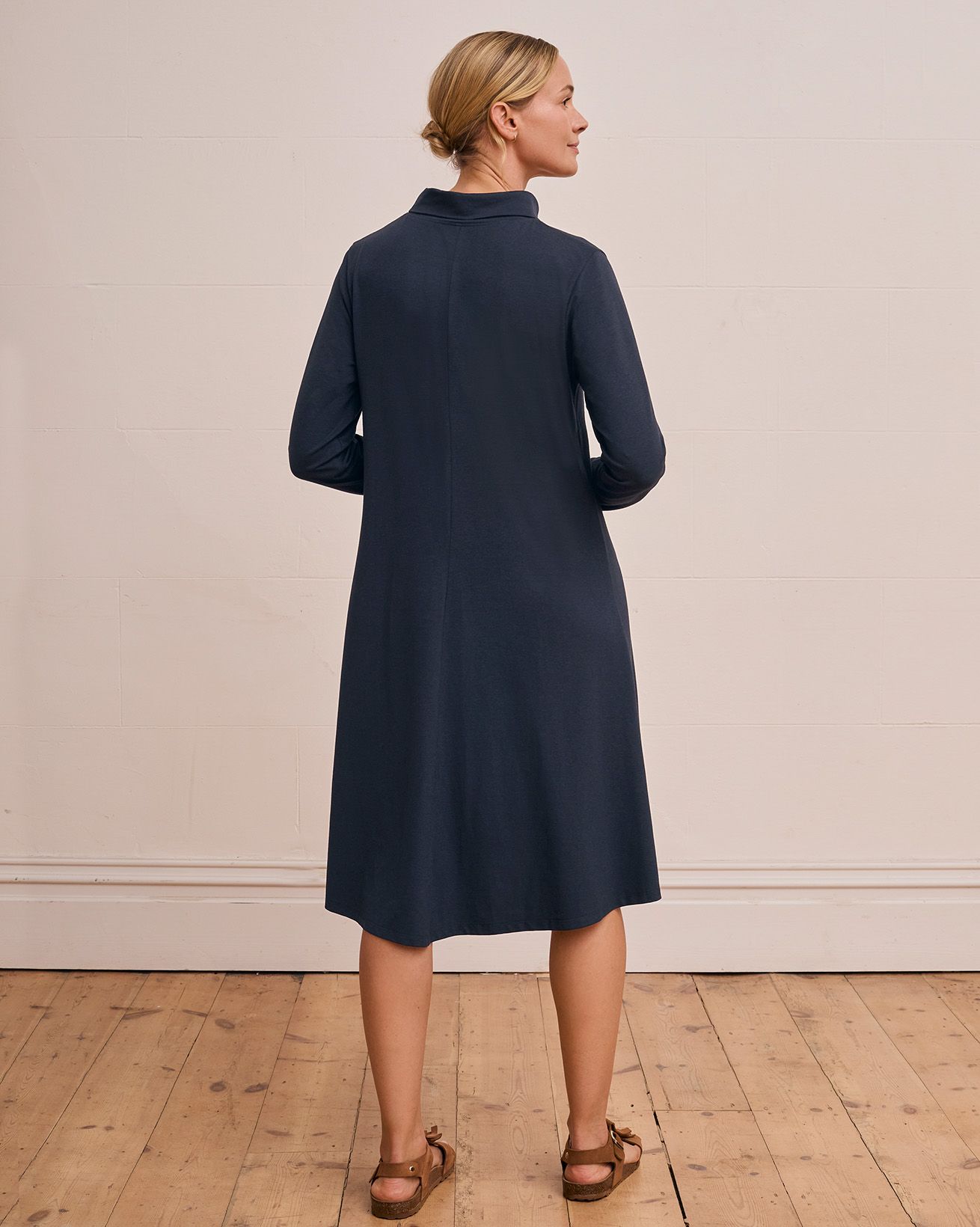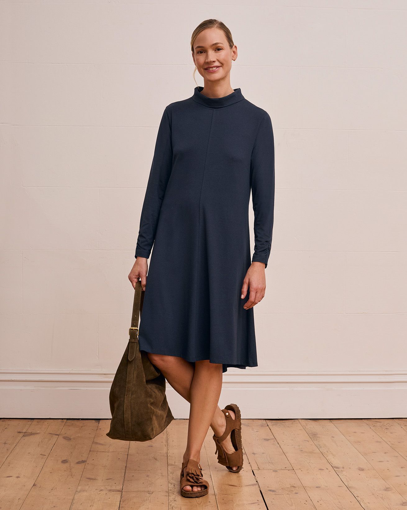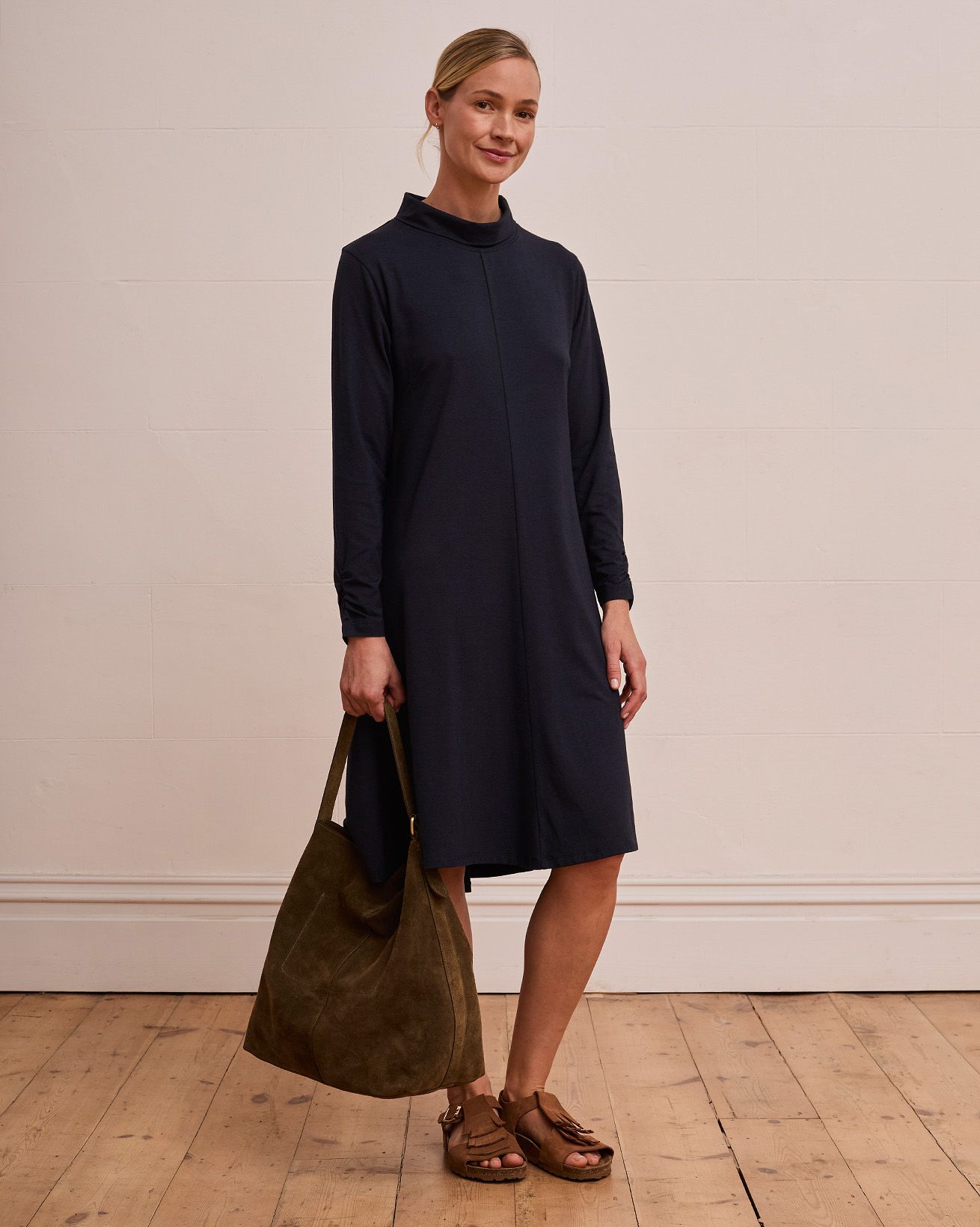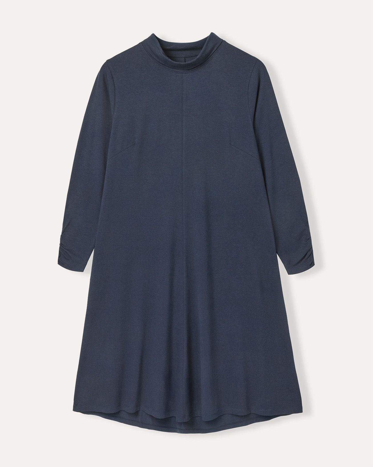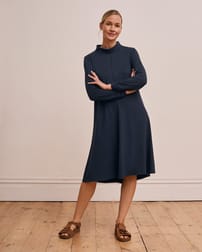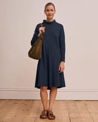 Our roll neck dress offers a relaxed swing fit with long sleeves and a clean, fastening-free design. Crafted to slip on easily, it provides an effortless silhouette that moves with you, making it a versatile addition to your wardrobe. Its simple, refined shape ensures comfort without compromising on style.