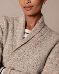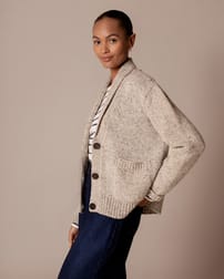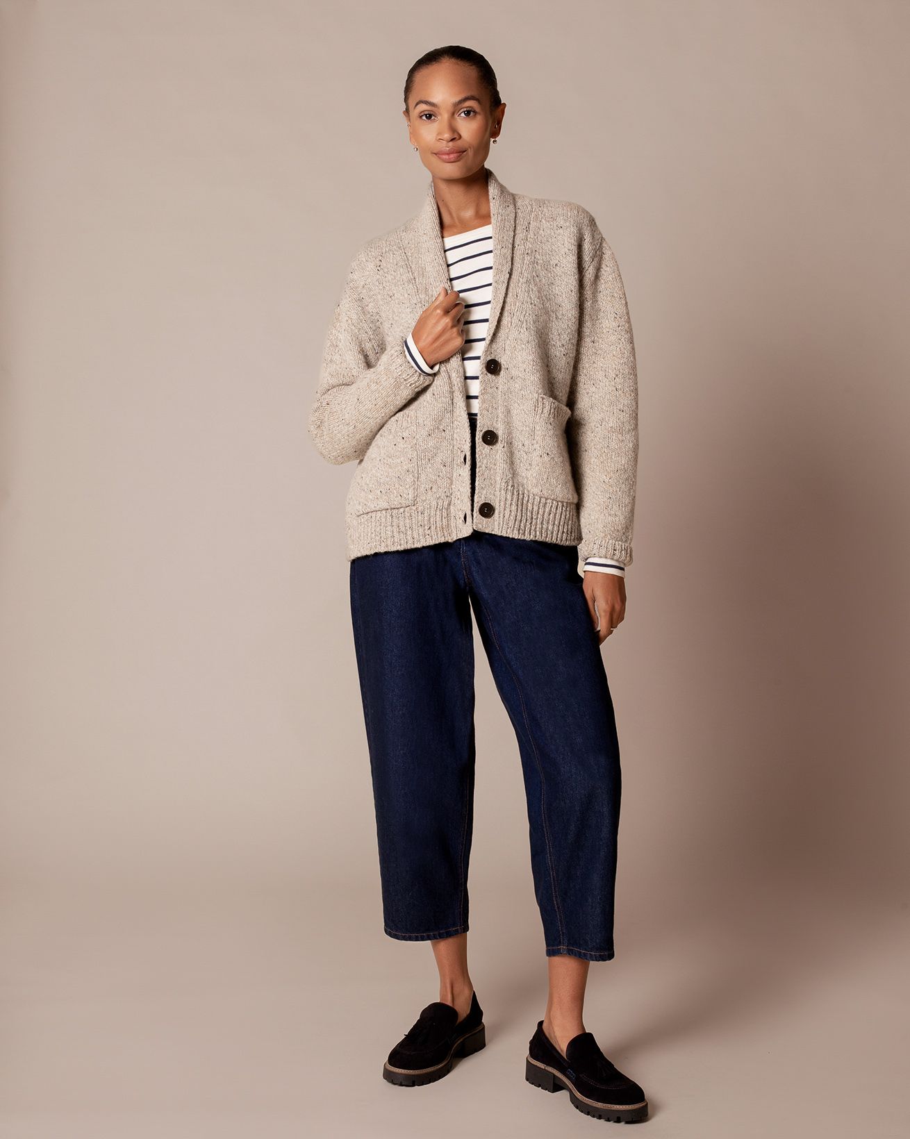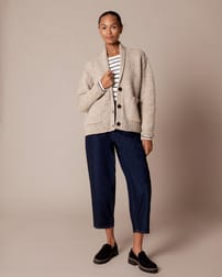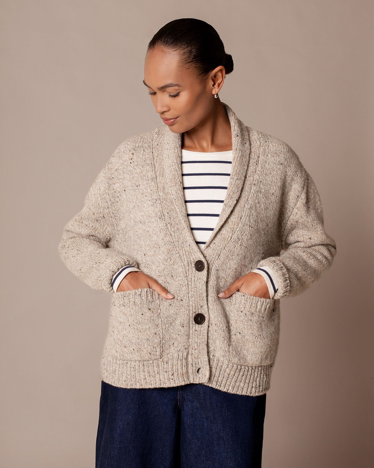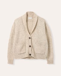 Crafted from pure wool, this cardigan features a shawl collar with a V neckline for a classic layered look. Detailed with patch pockets and finished with corozo button fastening, it offers warmth and structure with a refined, heritage feel.