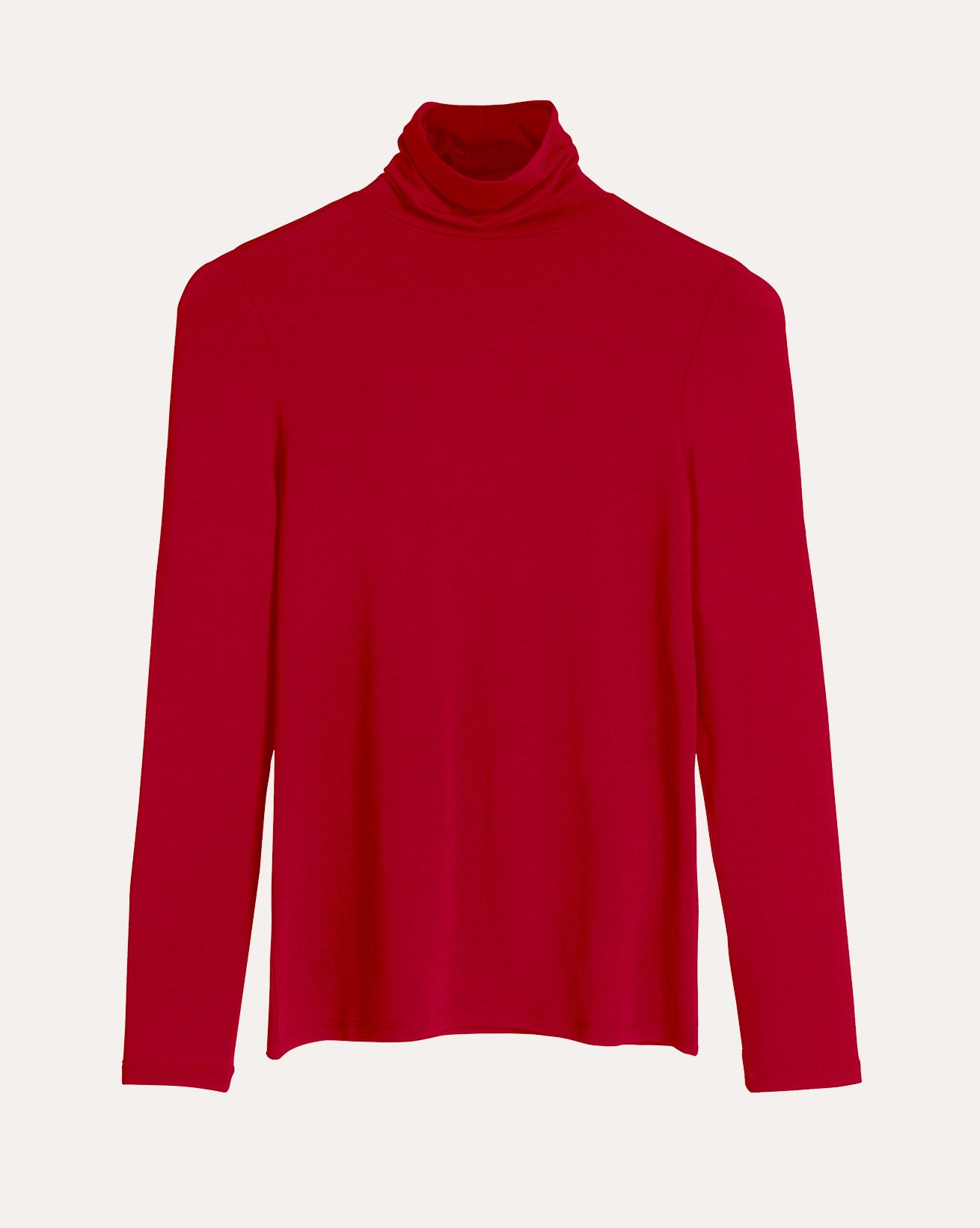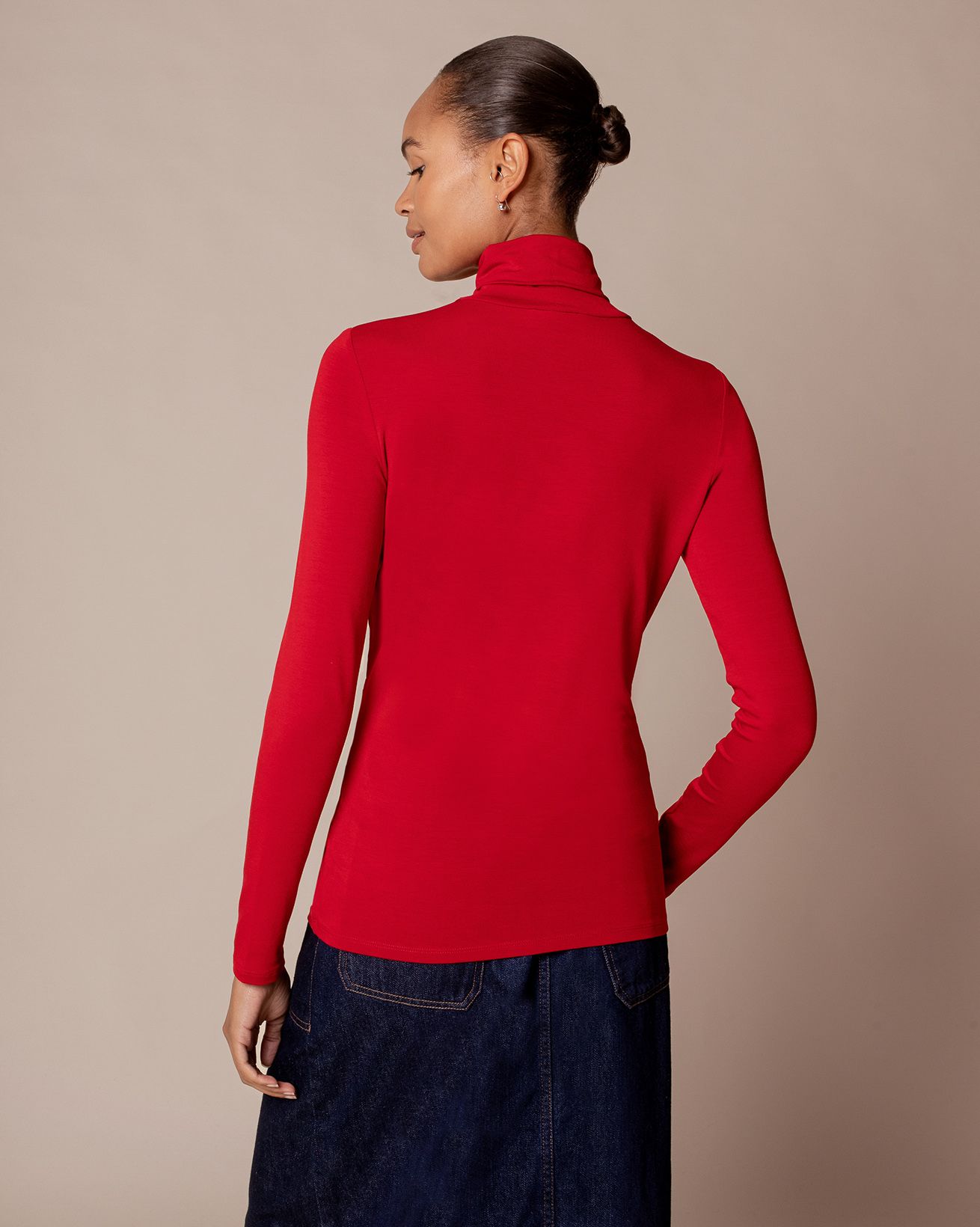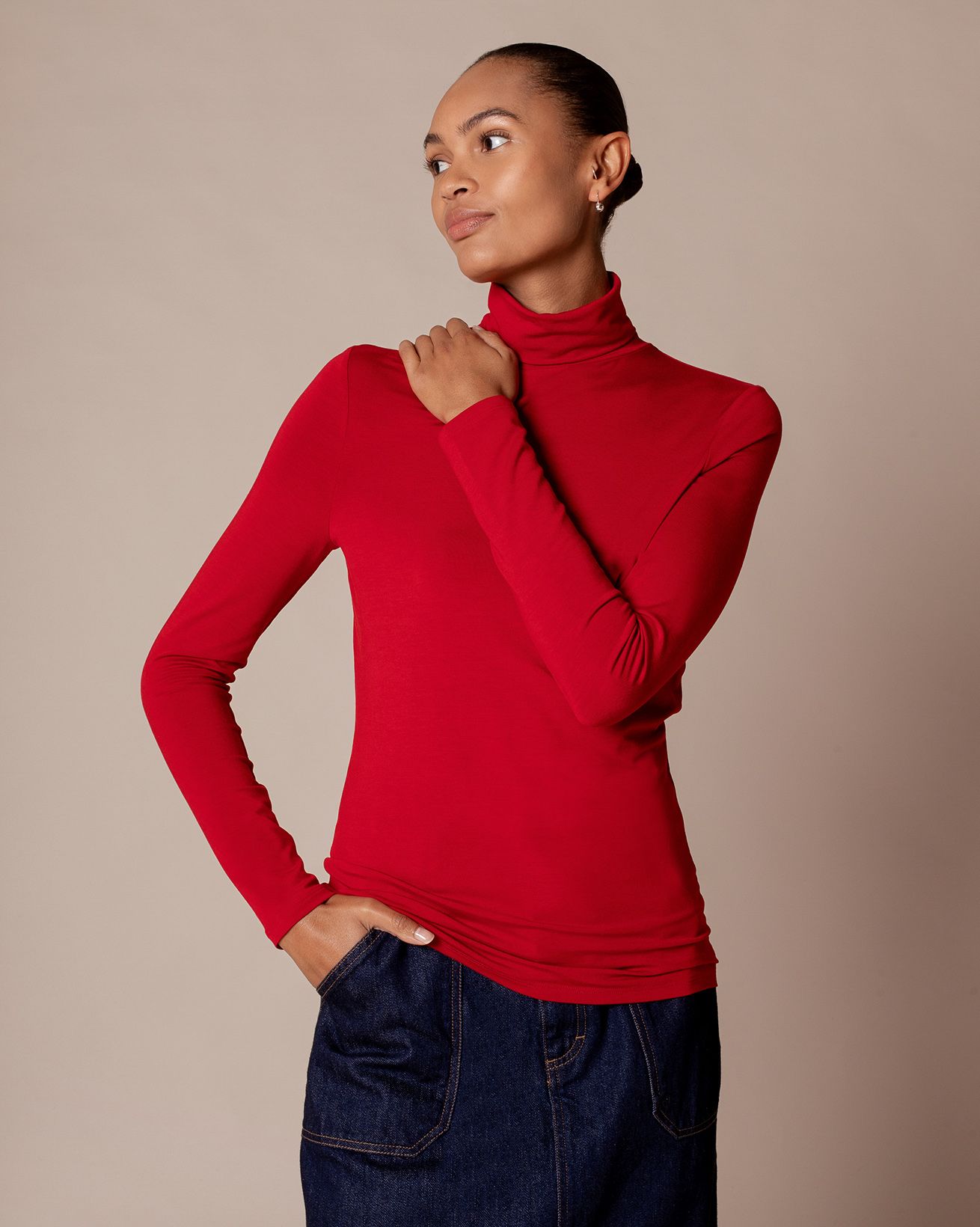 This fitted roll neck top, crafted from a beautifully smooth and lightweight modal-elastane blend, features long sleeves and a longer length, ideal for layering. Breathable and easy to style, it pairs perfectly with skirts, jeans, or trousers. Our best-selling product year after year, loved for its soft drape and versatile elegance.