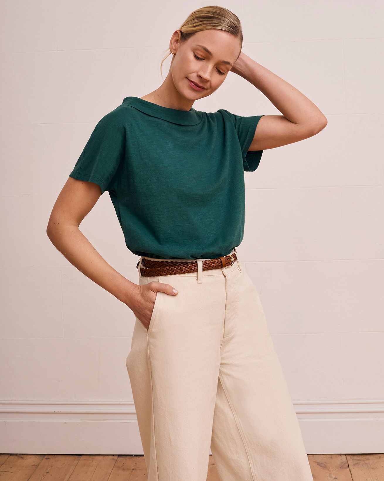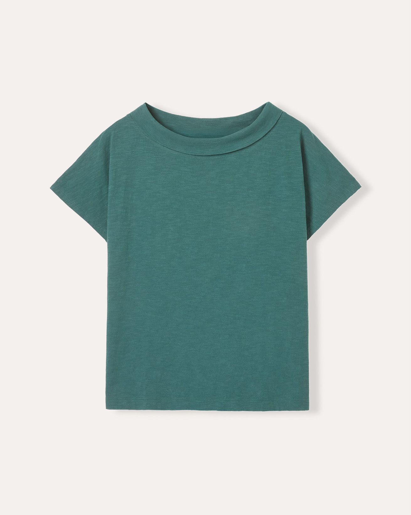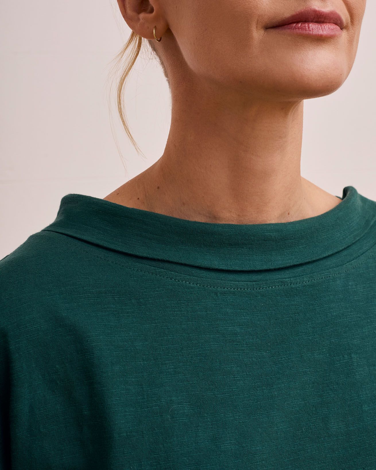 A casual staple with a boat neckline and fold-over collar, this tee’s straight fit and grown-on sleeves make it perfect for relaxed dressing. The slub texture adds visual depth for a versatile, laid-back style.