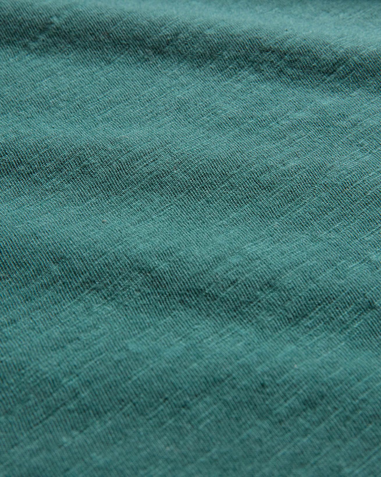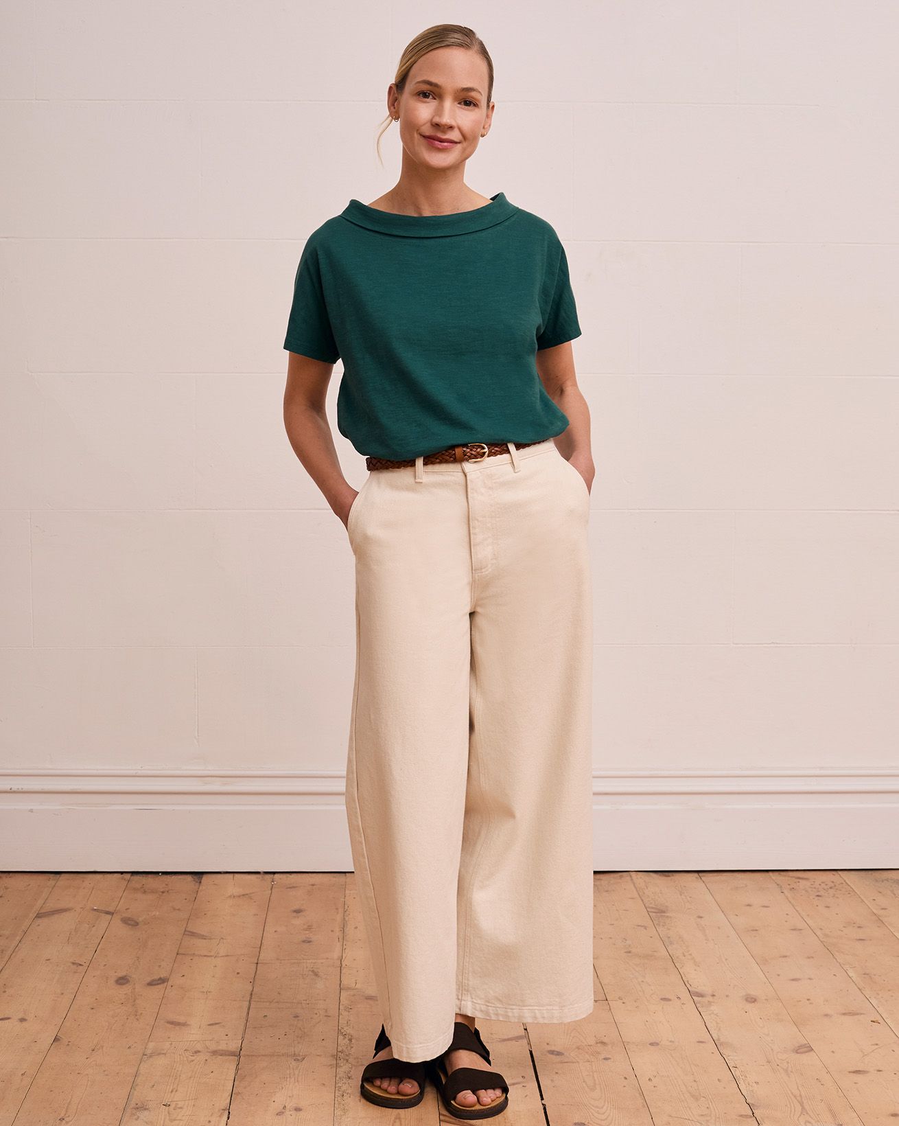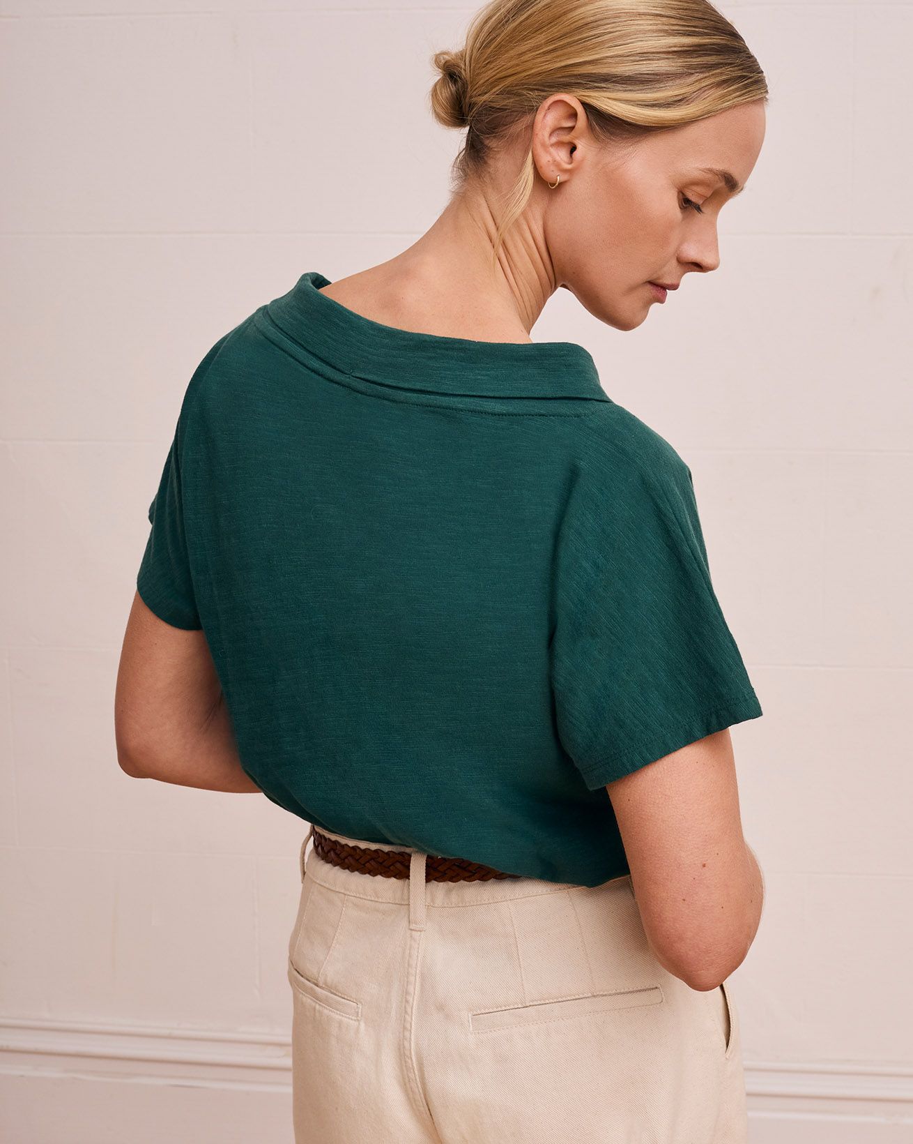 A casual staple with a boat neckline and fold-over collar, this tee’s straight fit and grown-on sleeves make it perfect for relaxed dressing. The slub texture adds visual depth for a versatile, laid-back style.