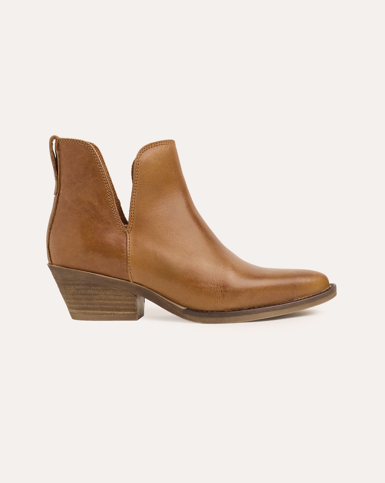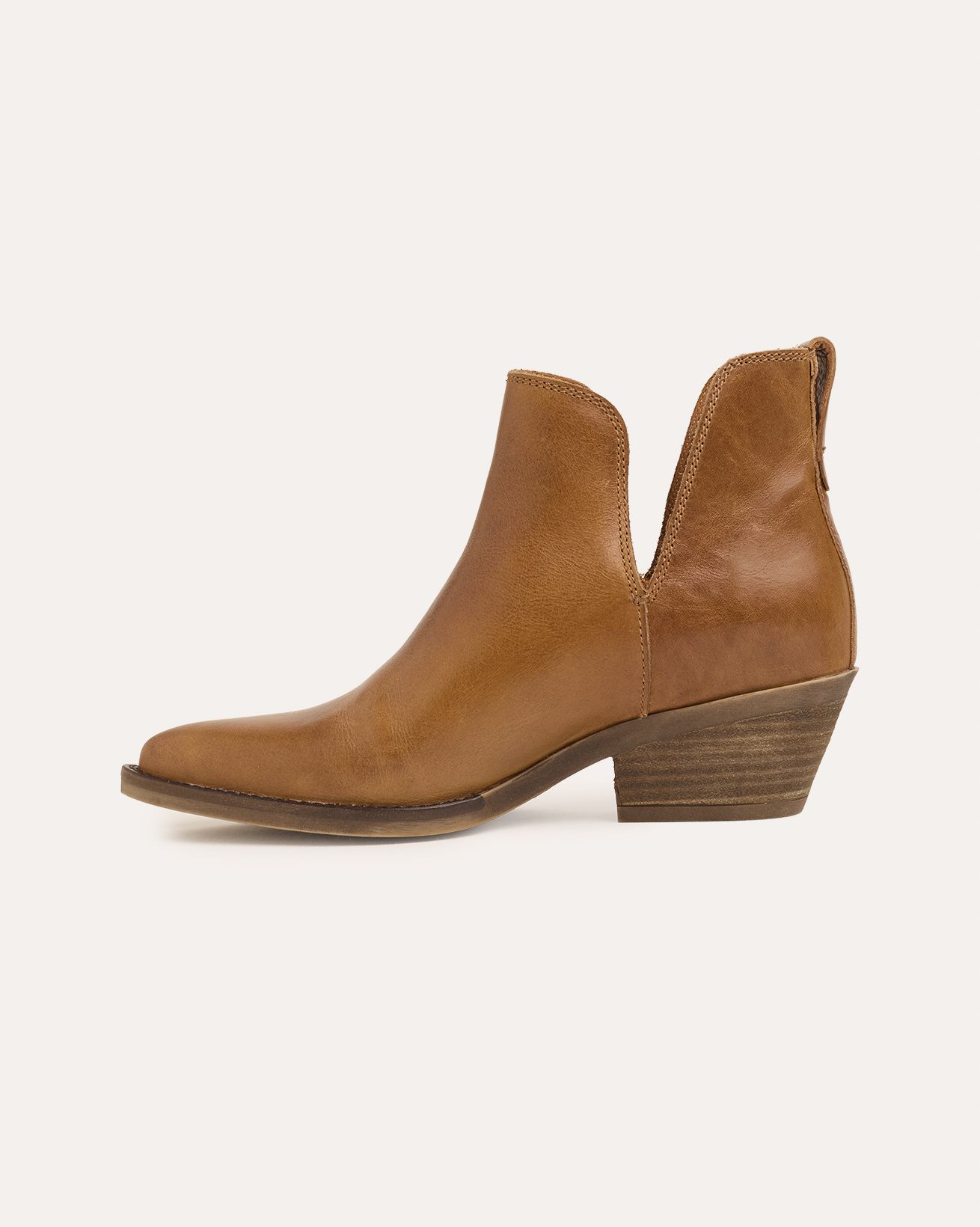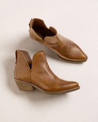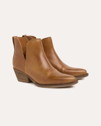 Leather ankle boots designed with a distinctive split detail and a convenient pull-on heel tab. They're finished with a cowboy boot-style sole and heel.