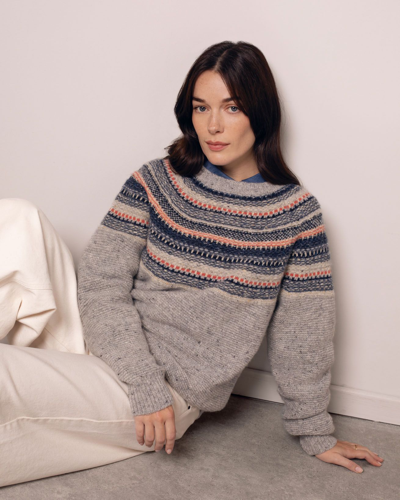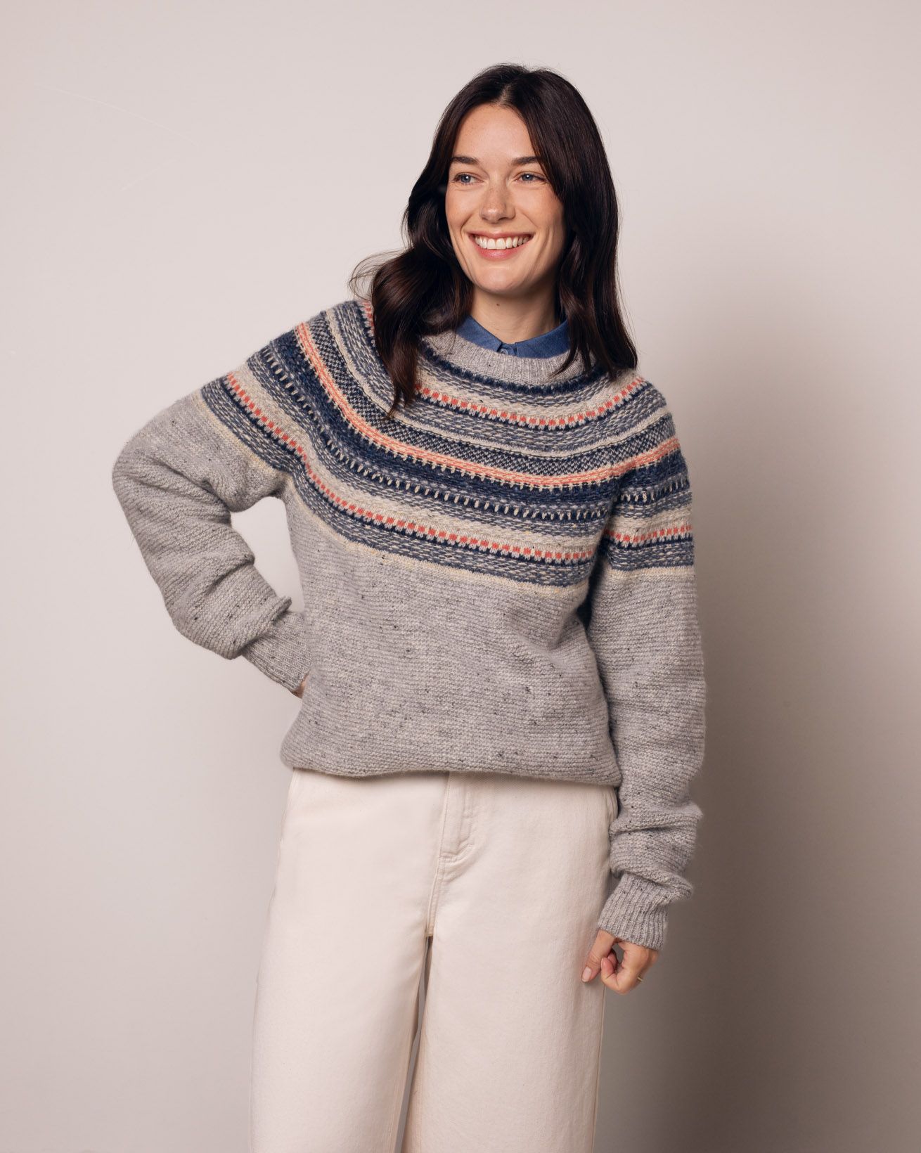 Crafted from authentic Donegal Merino Wool blended with alpaca, this button-through top captures the wool’s signature mix of rustic charm and luxurious softness. Spun in Donegal, Ireland, the yarn features up to six individual colours with seven or eight flecks scattered across the surface, giving the knit its rich, dimensional character. Finished with a crew neck, grown-on sleeves, float-stitch yoke detailing, and ribbed trims, it’s a warm, regular-fit essential.