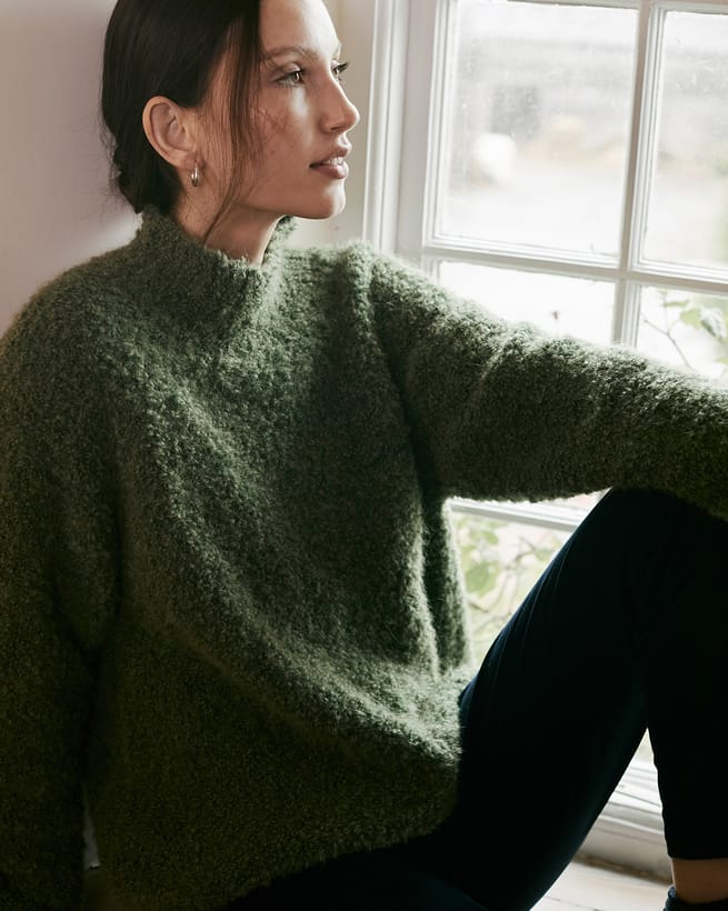 Topped with a funnel neck for a modern silhouette, this midweight jumper features ribbed accents at the collar, hem and cuffs. The yarn is a twisted combination of different shades, giving a richly coloured, textured effect.