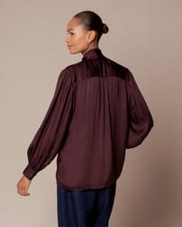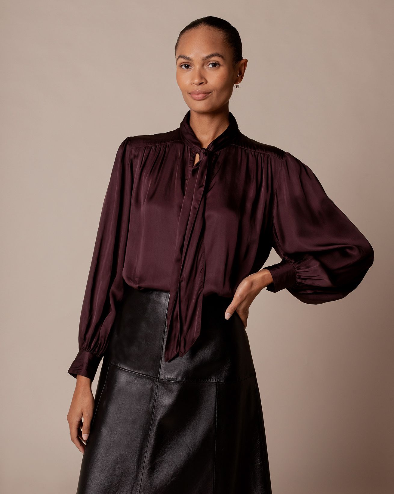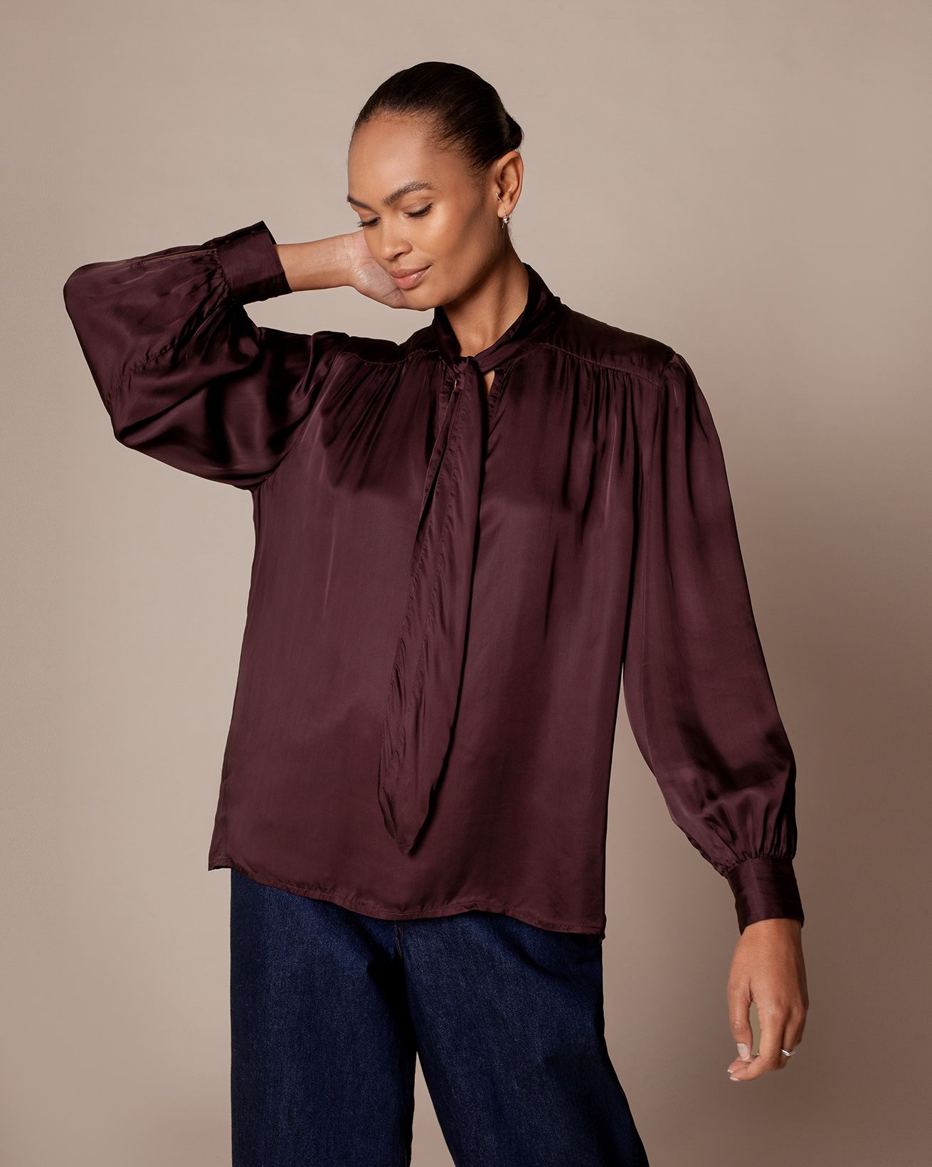 This raisin-hued blouse is crafted from lightweight viscose and features a V-neckline with a pussy bow tie. Designed with full-length sleeves and self-covered buttons, it offers a refined yet comfortable fit.