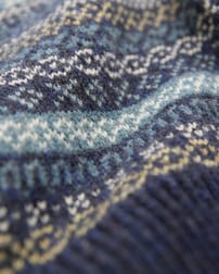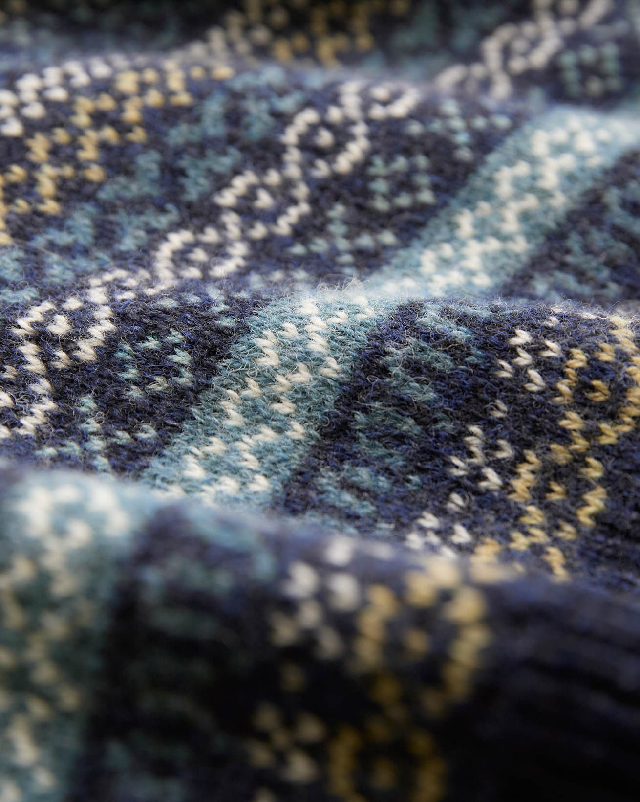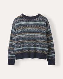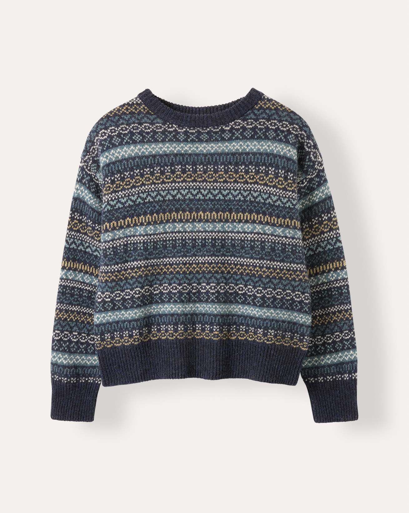 The Traditional Fair Isle Jumper is made from Shetland-style wool featuring a classic striped Fair Isle pattern. It has a drop shoulder, regular fit, and slightly shorter length, finished with ribbed trims. Crafted in Europe for a heritage-inspired design.
