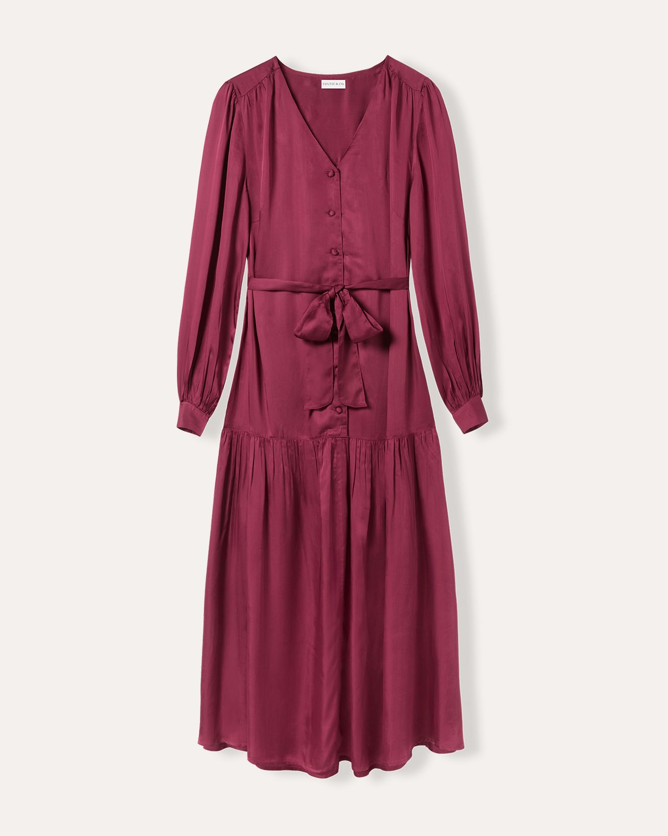 This maxi dress in viscose features a V-neckline with gathered detailing at the shoulders, cuffs, and skirt. Finished with self-covered buttons and a self-tie belt, it offers a softly tiered silhouette with fluid movement.