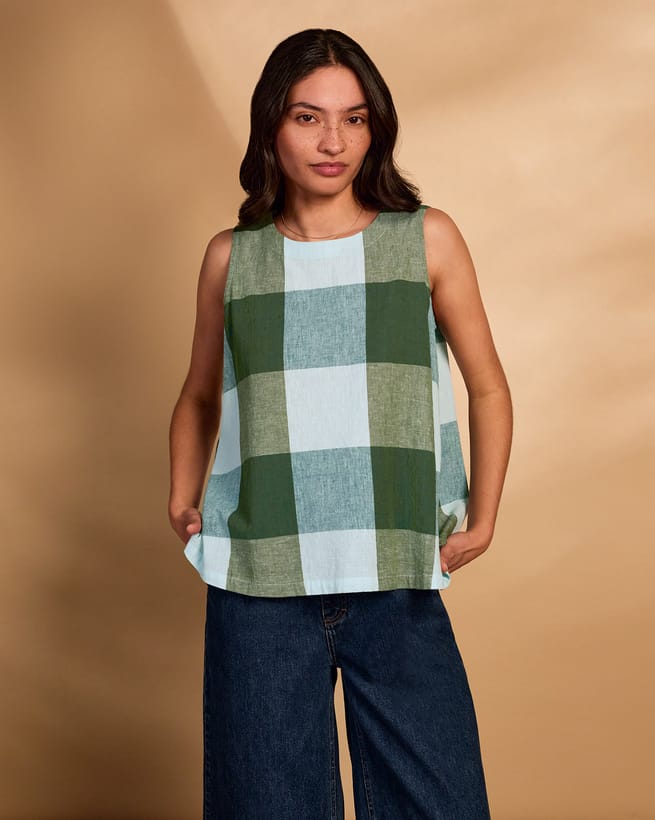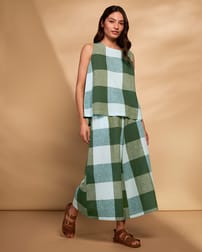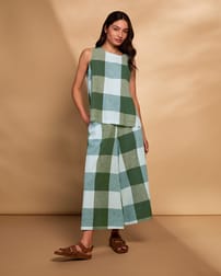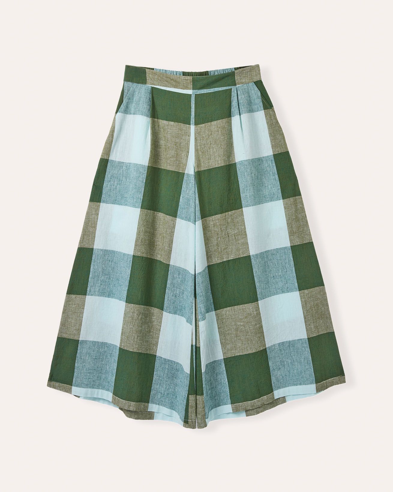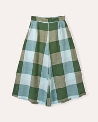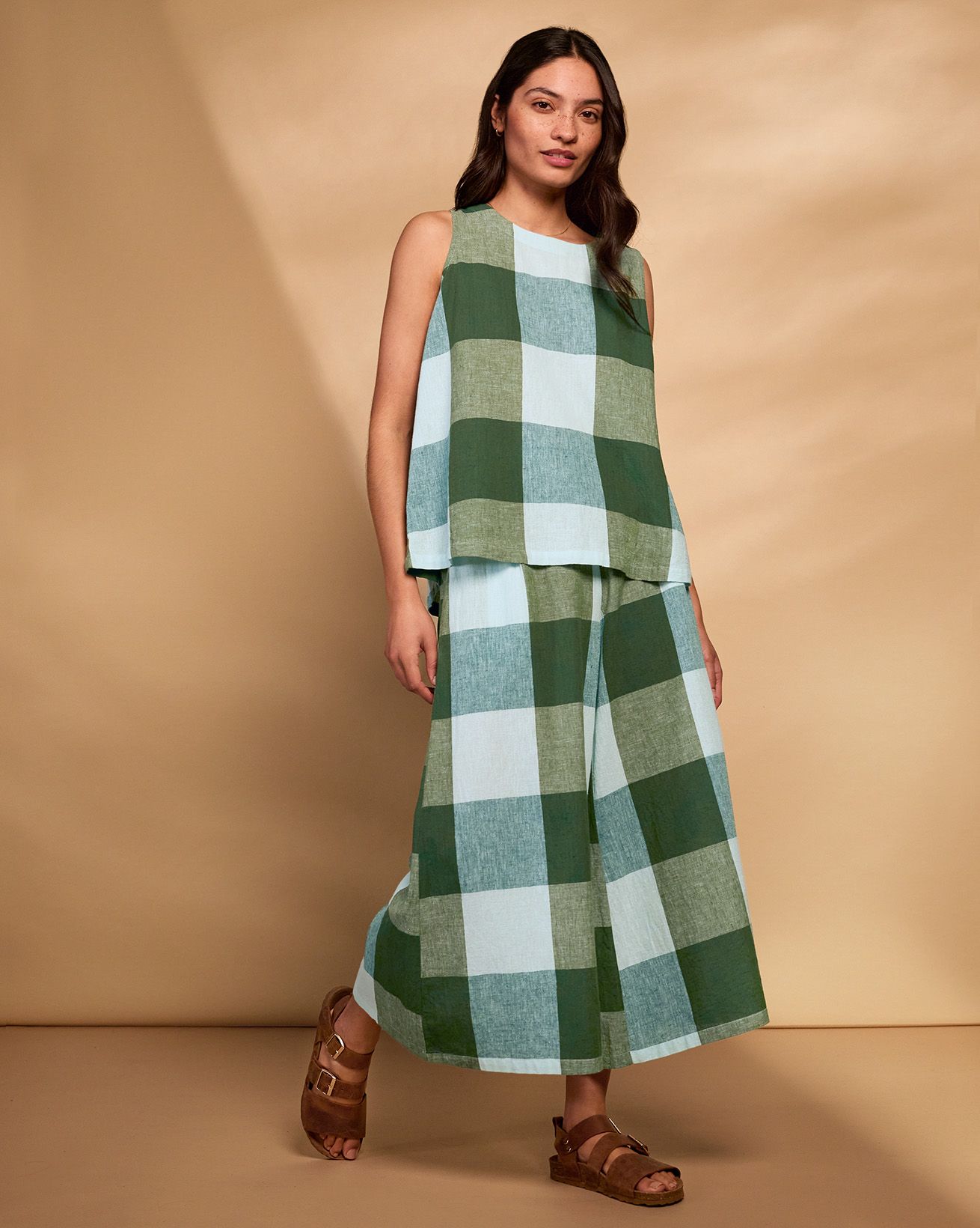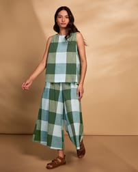 Crafted from yarn-dyed check fabric, these wide-leg ankle grazers combine comfort with refined detail. Featuring front and back pockets and a half-elasticated waist, they offer ease of wear and a relaxed silhouette. Designed to coordinate seamlessly with the matching top, this piece embodies thoughtful design and enduring quality.