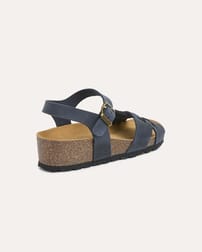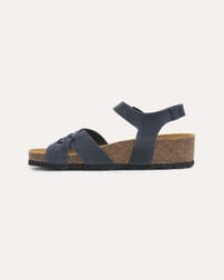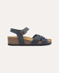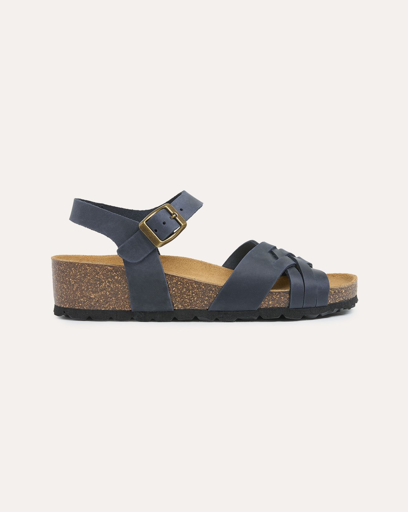 These sandals feature a subtly wedged sole and two cross-over straps, secured with an adjustable ankle buckle for a refined fit. Their thoughtful design offers a natural, comfortable wear that complements a variety of outfits with understated sophistication.