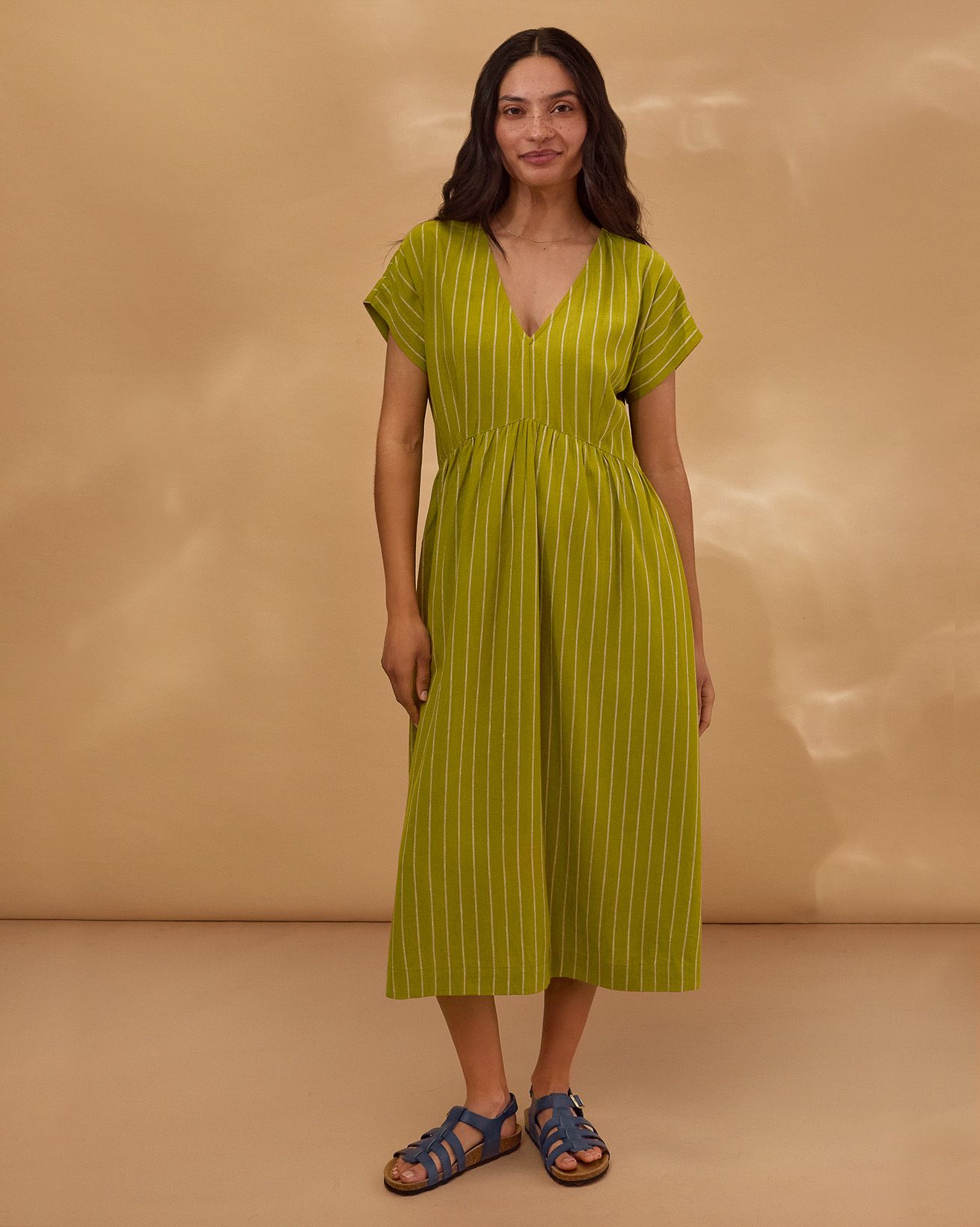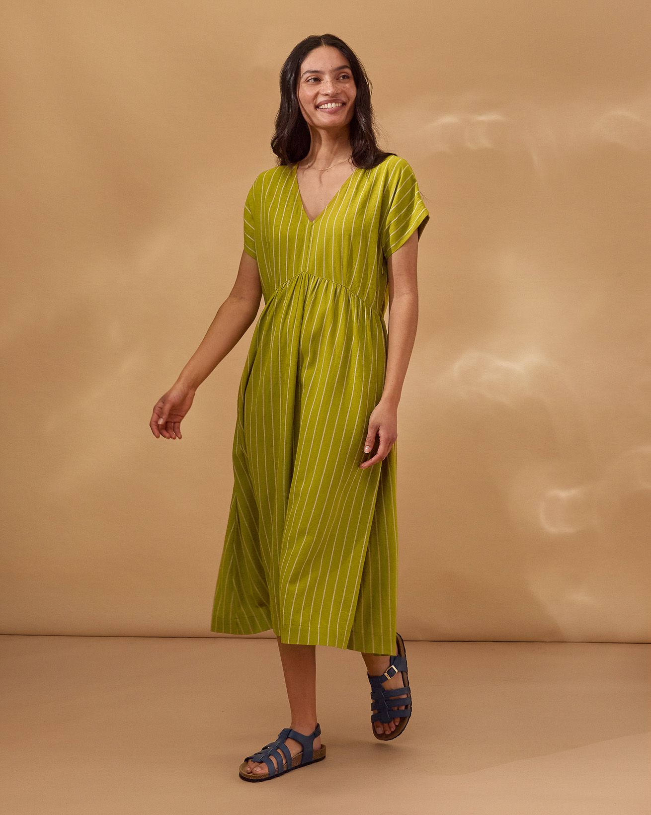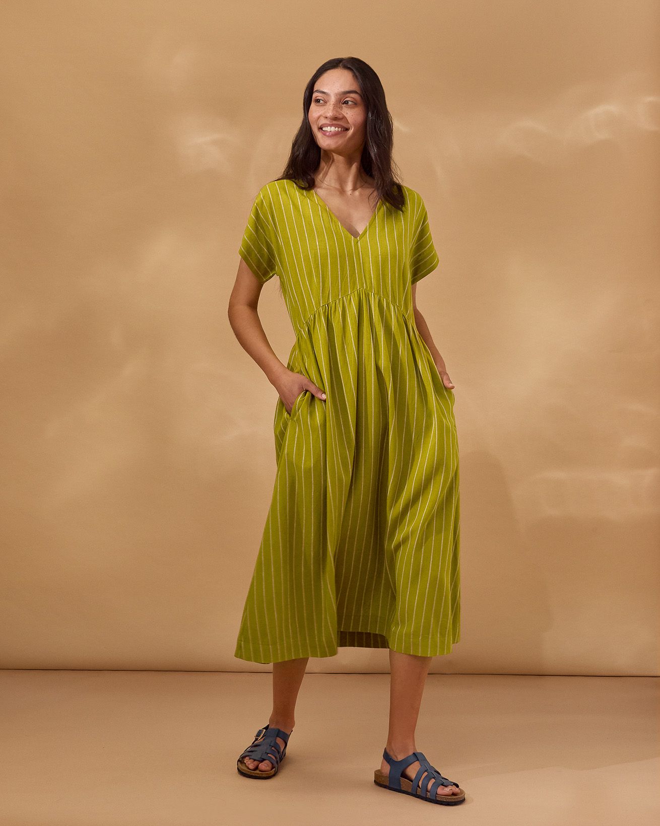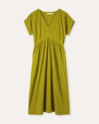 This relaxed-fit midi dress features a flattering V-neckline and short sleeves, designed for effortless wear with a pull-over style and fastening-free finish. Crafted from yarn-dyed striped fabric, it showcases subtle wrap waist detailing that adds a refined touch to its natural, comfortable silhouette.