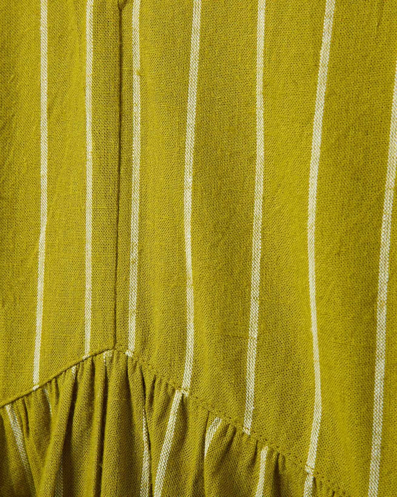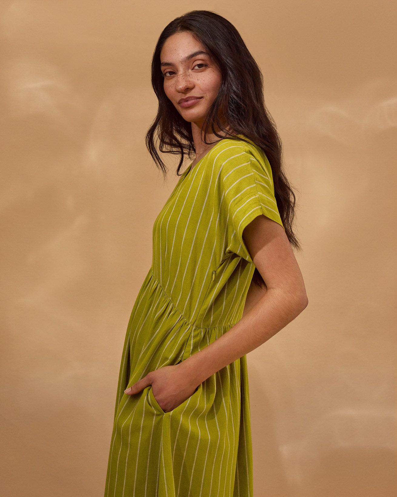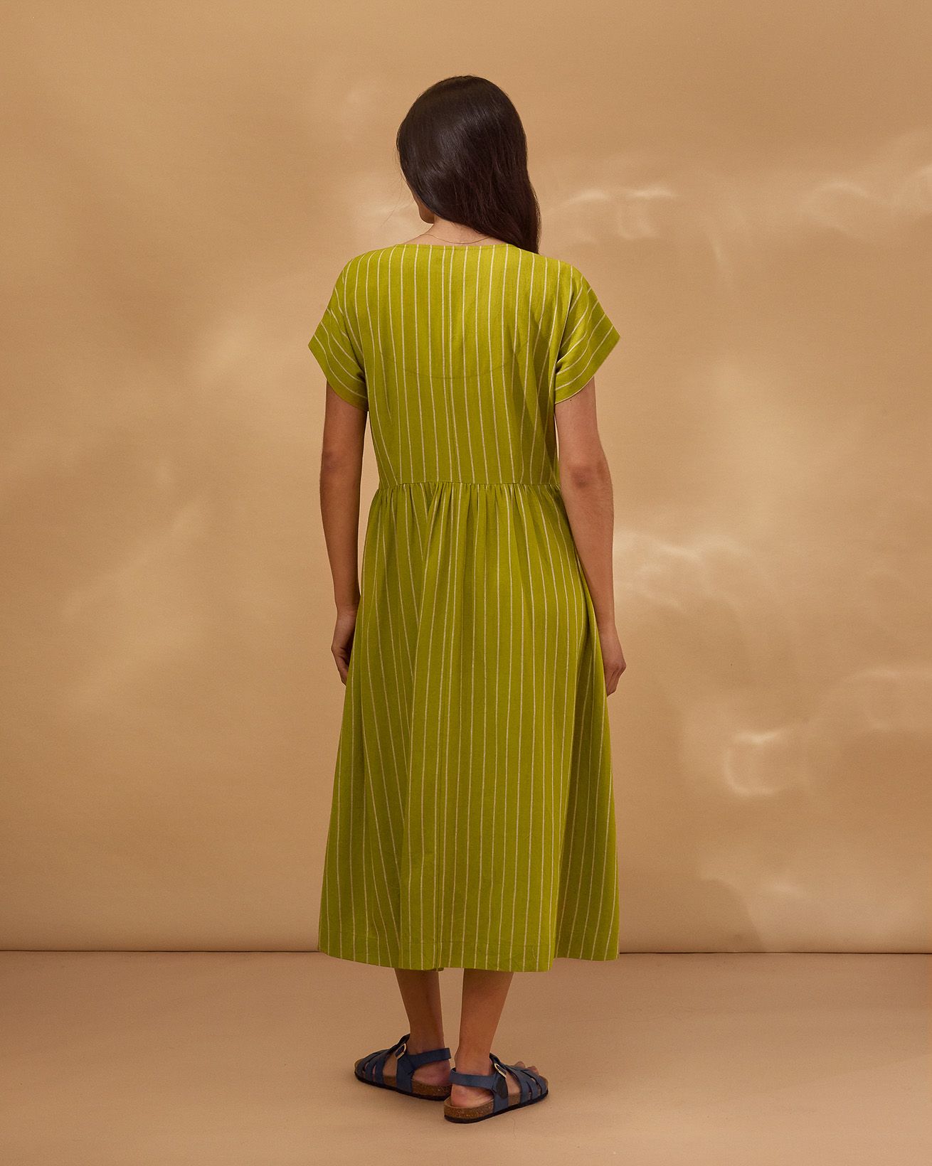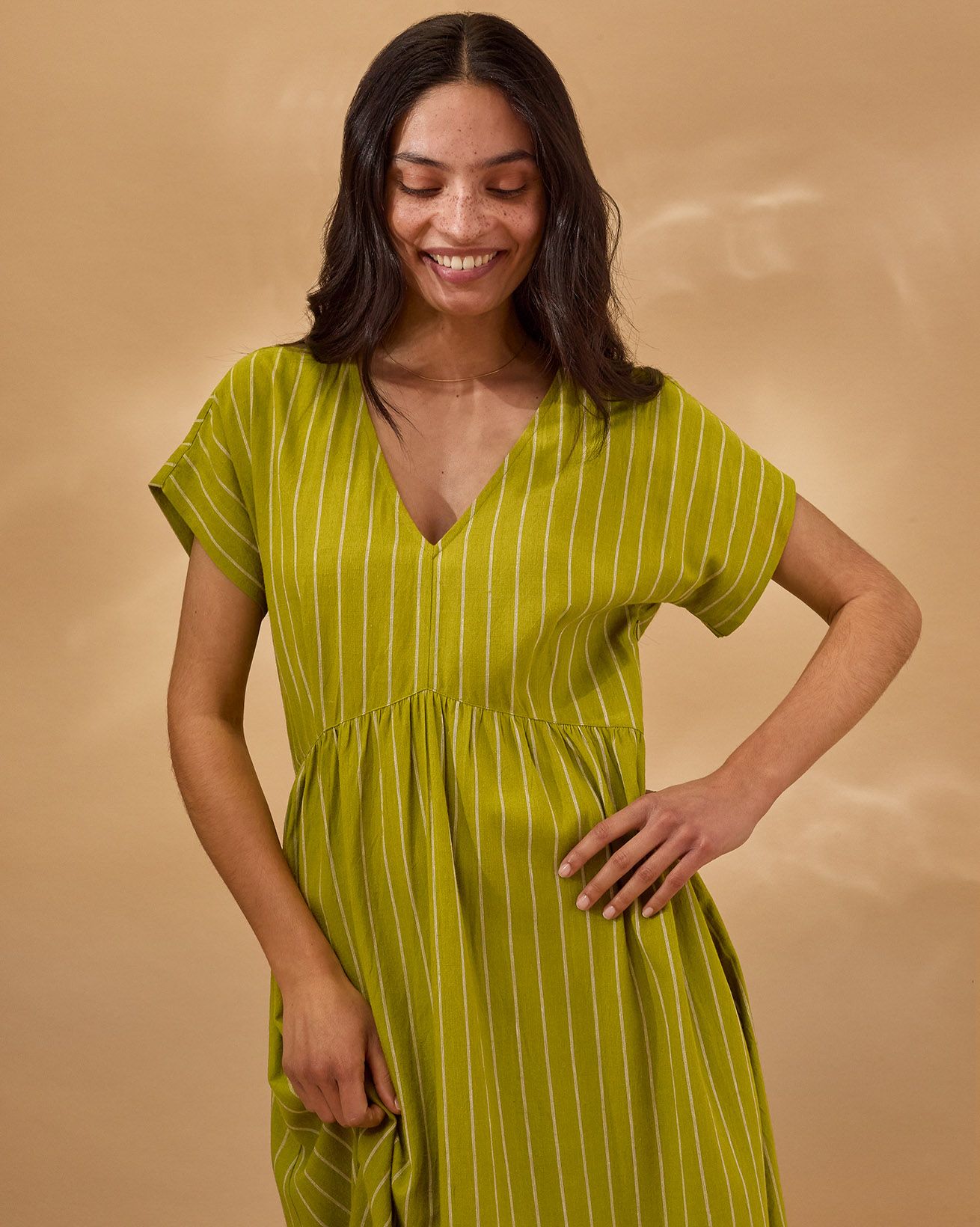 This relaxed-fit midi dress features a flattering V-neckline and short sleeves, designed for effortless wear with a pull-over style and fastening-free finish. Crafted from yarn-dyed striped fabric, it showcases subtle wrap waist detailing that adds a refined touch to its natural, comfortable silhouette.