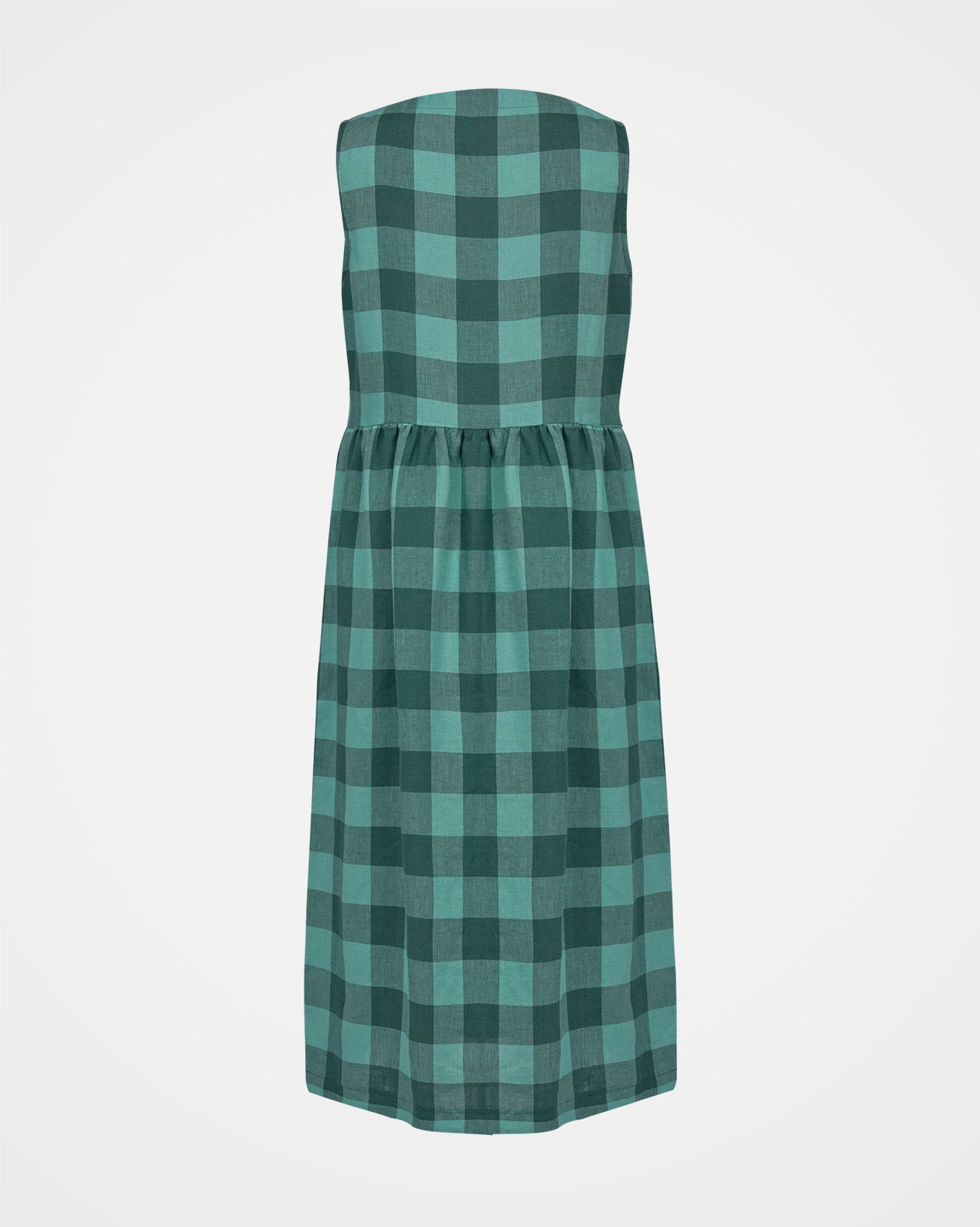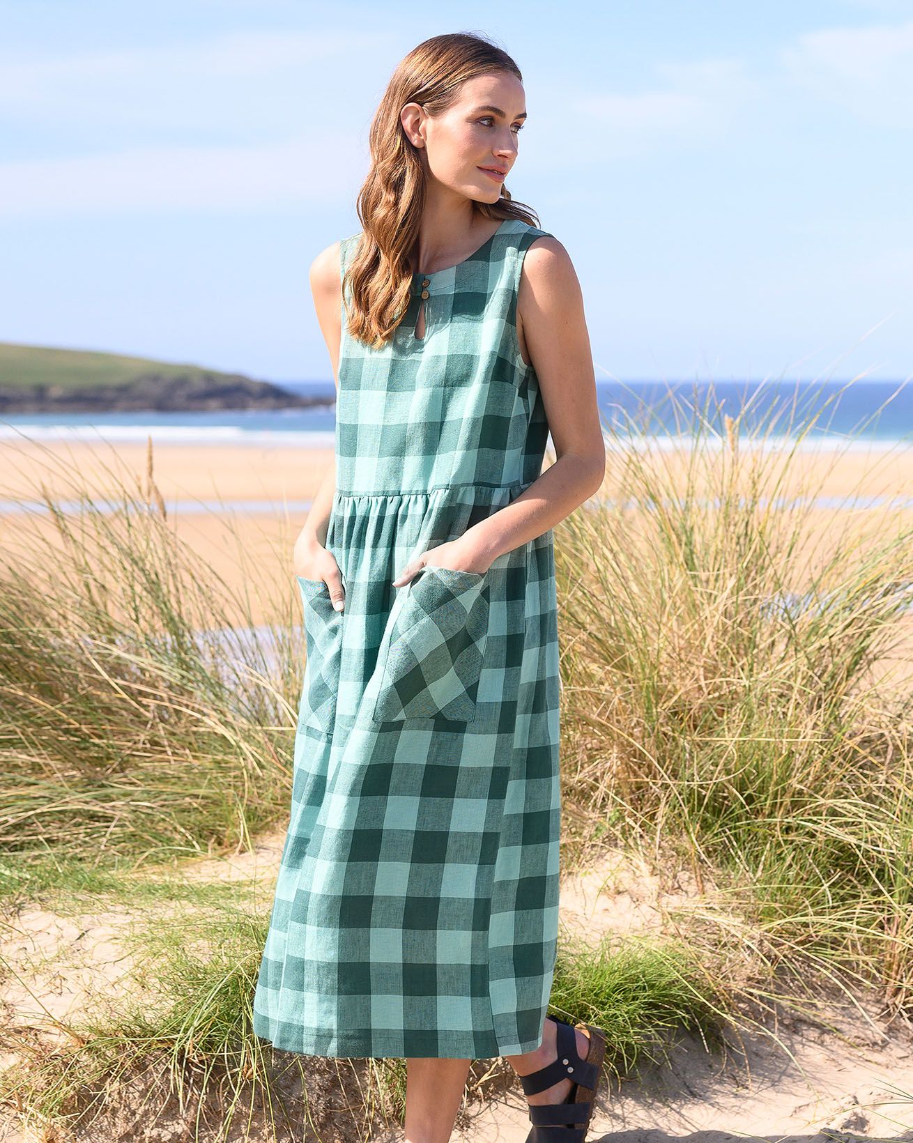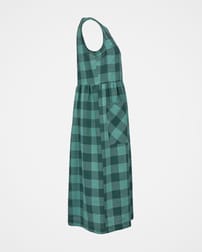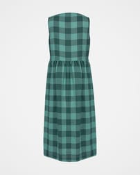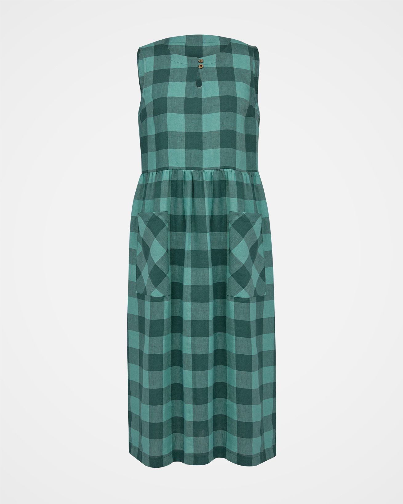 This sleeveless midi dress is made from a mid-weight, woven fabric. The large scale gingham print is bright and summery. The skirt is gathered at the waist seam to provide a full, drapey appearance, and has large patch pockets that are cut on the bias, adding nice detail. The crew neckline features a keyhole detail with two coconut buttons and loop fastenings.