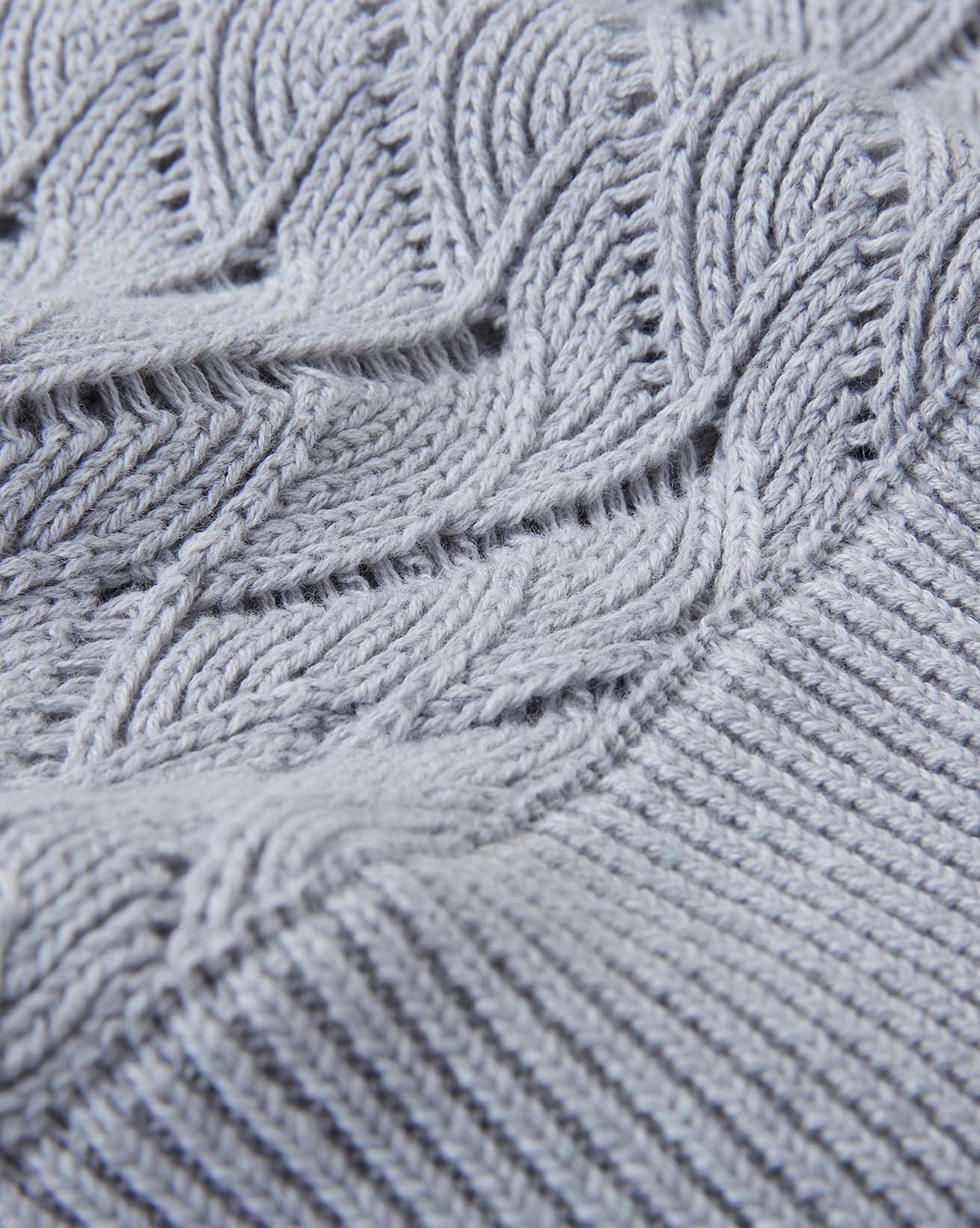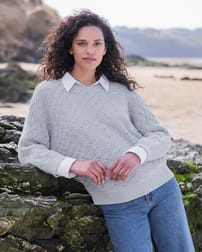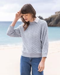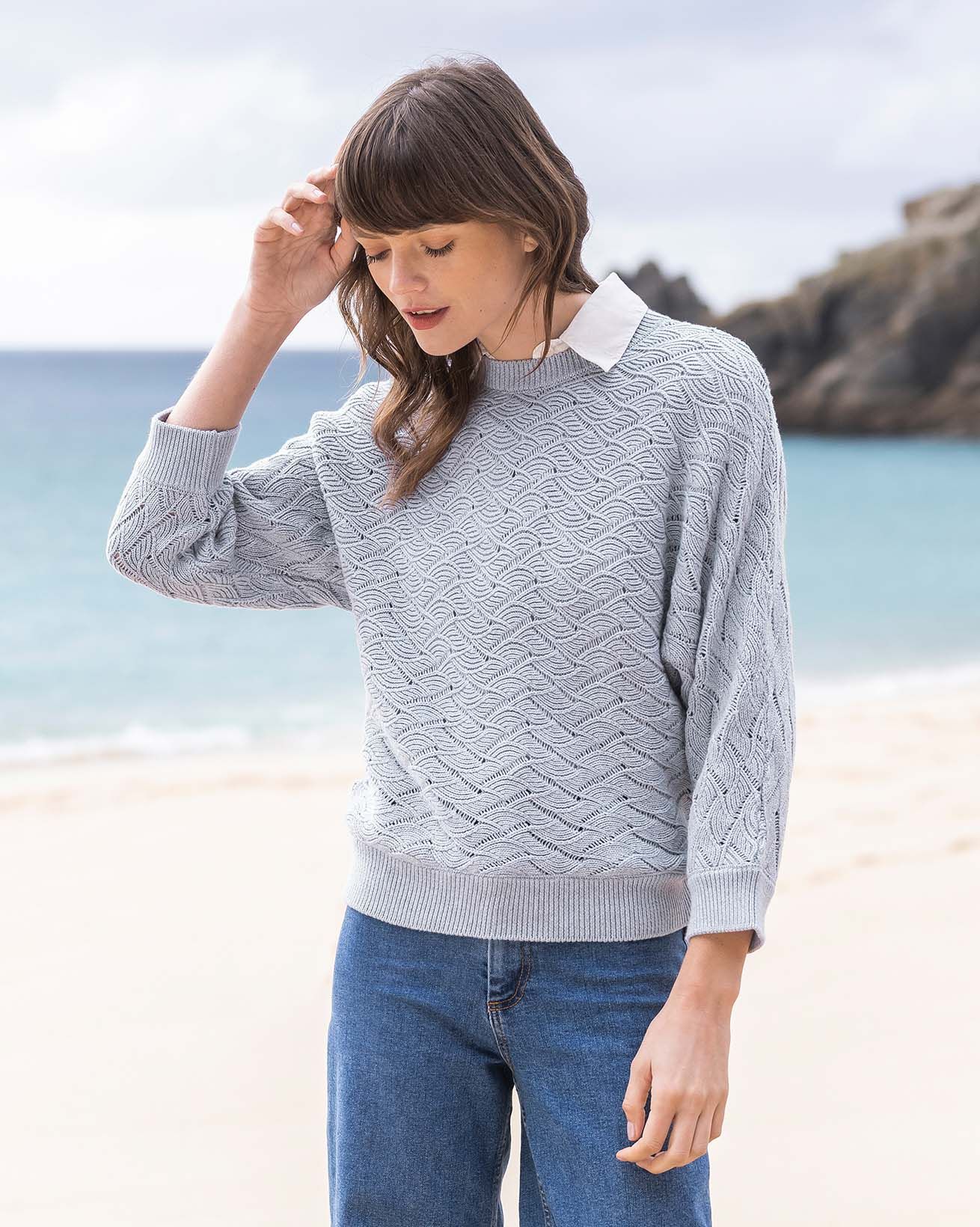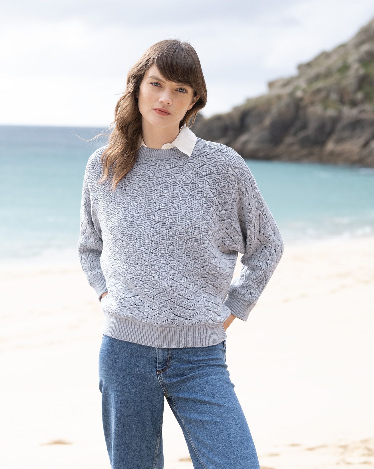 A beautiful, relaxed sweater featuring a crew neckline and a modern take on a batwing, grown-on sleeve. Far more than just a basic knit, it features an intricate wave-style pointelle pattern, that adds texture and substance to the style. Completed with ribbing at the collar, cuff and hem, this sweater looks great over a white linen shirt or paired with our midi skirt.